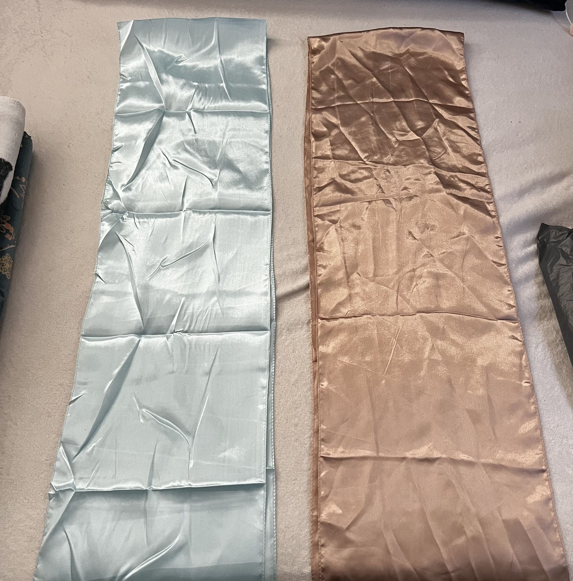Used once for a baby shower 15 satin baby blue and 15 satin nude/brown perfect condition they measure 12”x108” (PRICE IS NEGOTIABLE )