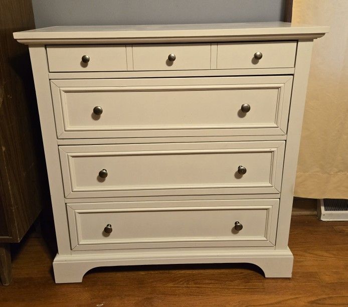 $30.00 - White 4-drawer dresser. Measures 36 long x 16 1/2" deep x 36 tall. Top drawer is felt lined. One drawer has markings on bottom of drawer. Good, solid condition. Cross-posted, pickup in Woodridge. $30.00