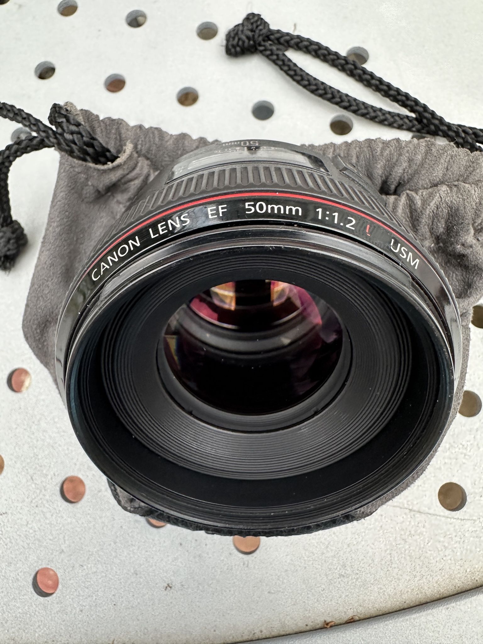 Clearly distinguished by its bright maximum aperture, the Canon EF 50mm f/1.2L USM is a normal-length L-series prime also sporting a robust physical design and advanced optical layout. The impressively fast f/1.2 maximum aperture affords a great degree of control over depth of field for isolating subjects and producing desirable selective focus effects. Complementing these qualities is a sophisticated optical composition, which includes one aspherical element to suppress spherical aberrations in order to achieve notable sharpness and clarity. A Super Spectra coating has also been applied to limit flare and ghosting and promote greater contrast and color accuracy in a variety of lighting conditions. Complementing the imaging attributes, a ring-type USM is employed to deliver quick and quiet autofocus performance along with full-time manual focus control. Manufacturer Included Items: Canon EF 50mm f/1.2L USM Lens Canon E-72 II 72mm Lens Cap Canon Lens Dust Cap E (Rear Lens Cap) Canon ES-78 Lens Hood for EF 50mm f/1.2L USM Lens Canon Lens Case LP1214 used in very good condition. always with filter. you can offer your price
