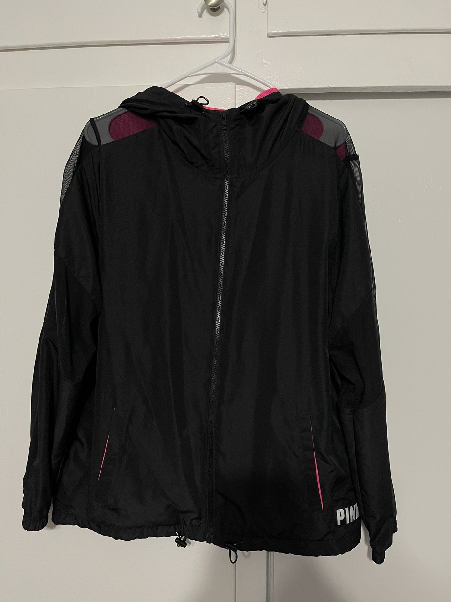 VS PINK black jacket with pink interior and mesh design on sleeves. I don’t think I’ve ever worn it, maybe just 1 time so definitely like new condition Size medium large