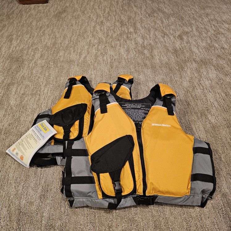 Stylish yellow and gray life vest with black accents. Perfect for water activities. $75 each 2 available- one with tags one without USCG Approval Type: Type III Intended Use: Recreational boating and watersports Buoyancy: 15.5 lbs Flotation Material: Polyethylene and PVC foam Features: Adjustable shoulder and body straps, full front-zip closure, and large armholes for movement DM with any questions.