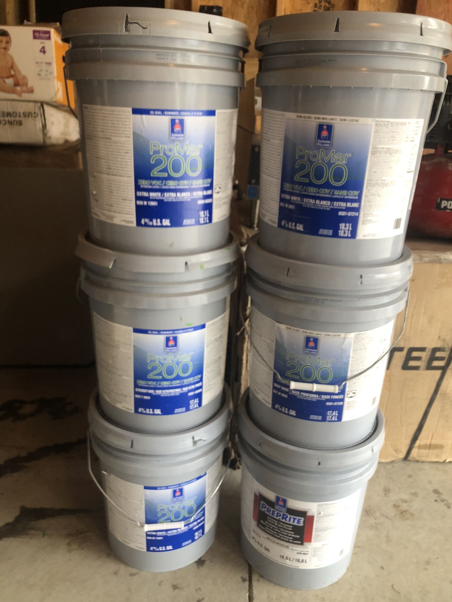 3 cubetas de pintura color blanco Látex para interior Sherwin Williams. 2 cubetas de Base blanca Sherwin Williams I cubeta de Látex Block filler color Blanco interior y exterior. Cada cubeta tiene mas de 4. US Galons