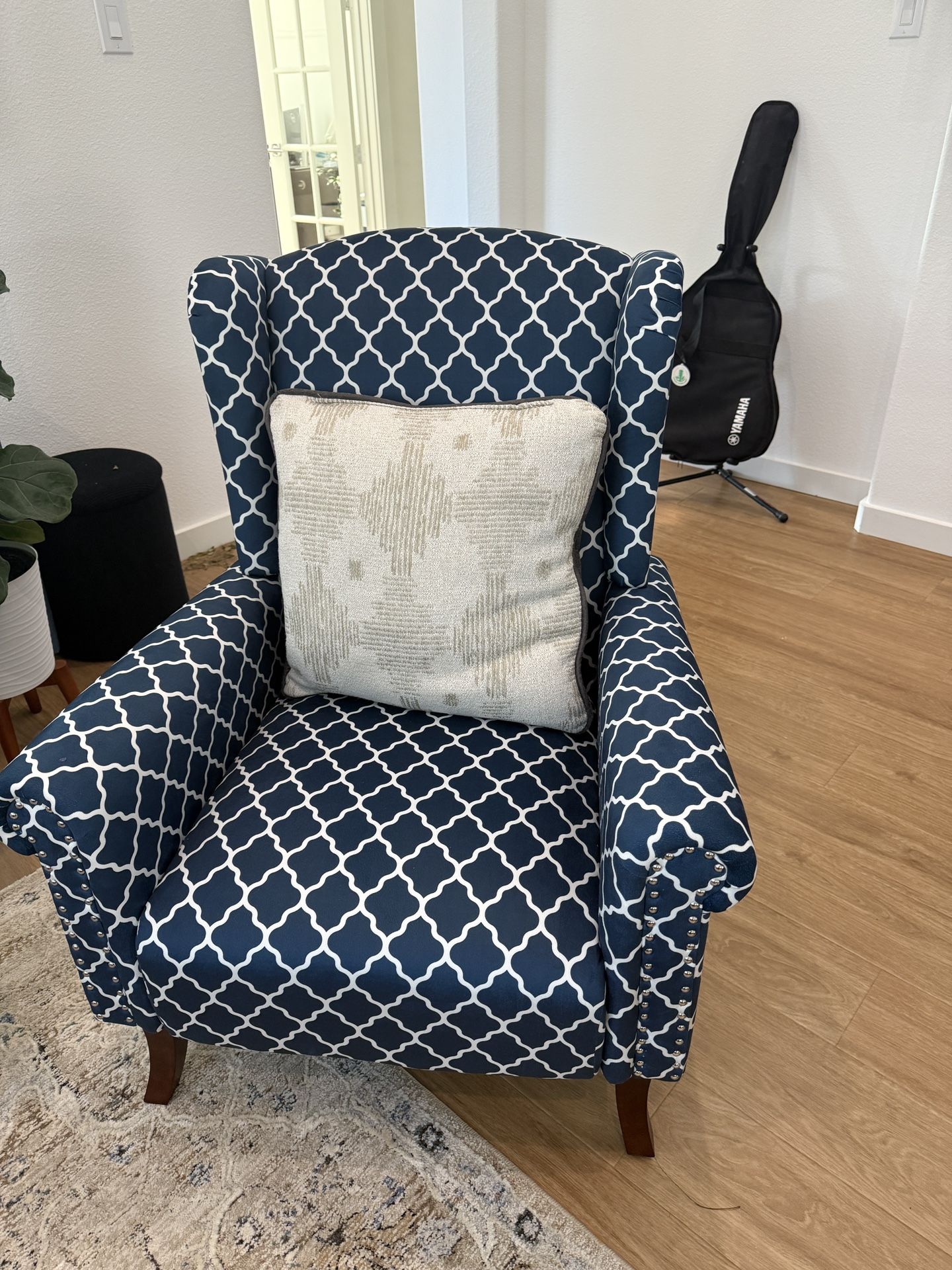 Modern Accent Chair, Comfy Wingback Armchair, Blue Plaid Club Chair with Wooden Legs