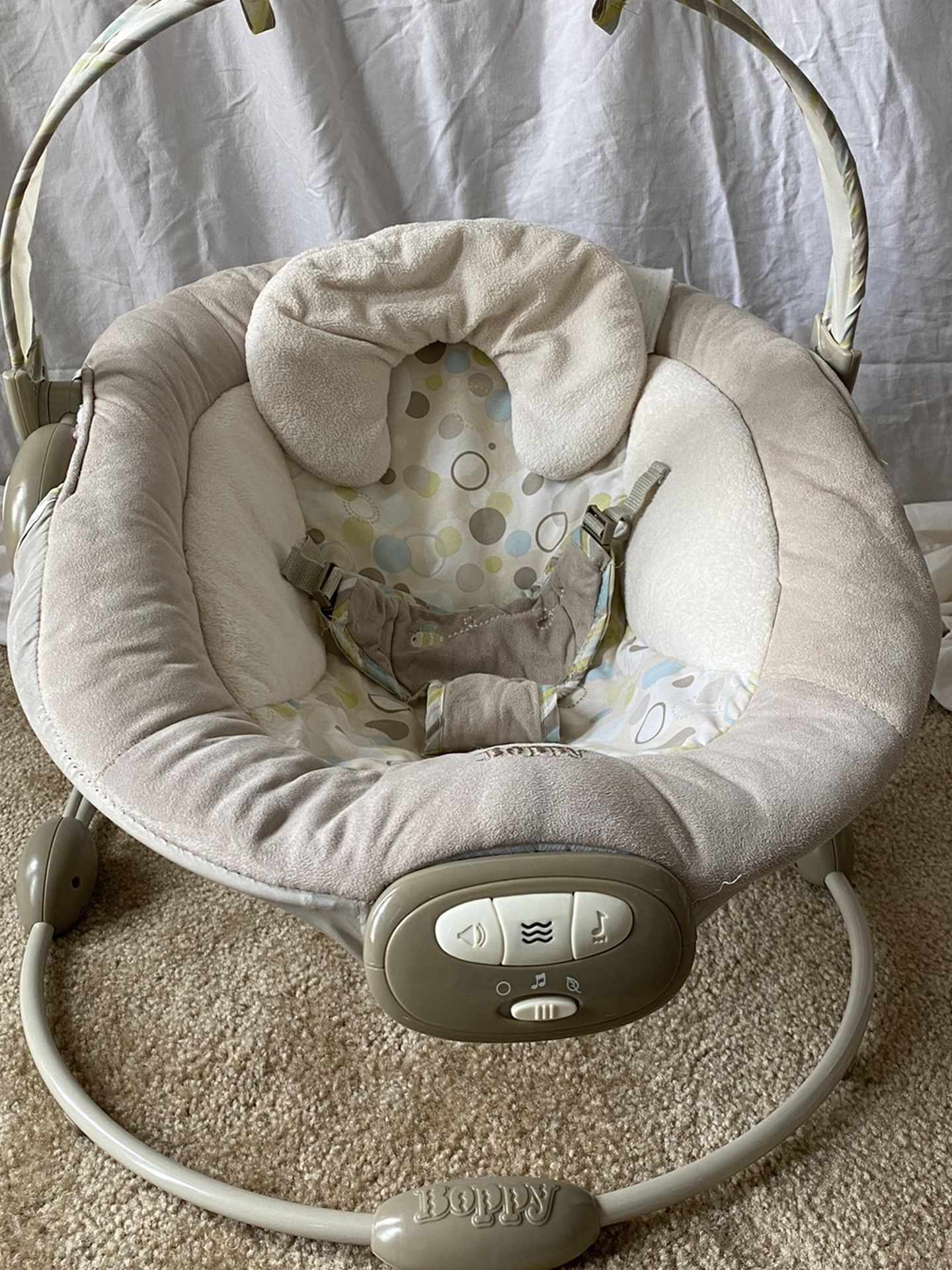 It’s tan with blue, brown and green circles. I don’t think the vibration works anymore. This was my daughters favorite seat as a baby-a lot of sleeping was done in it 😃