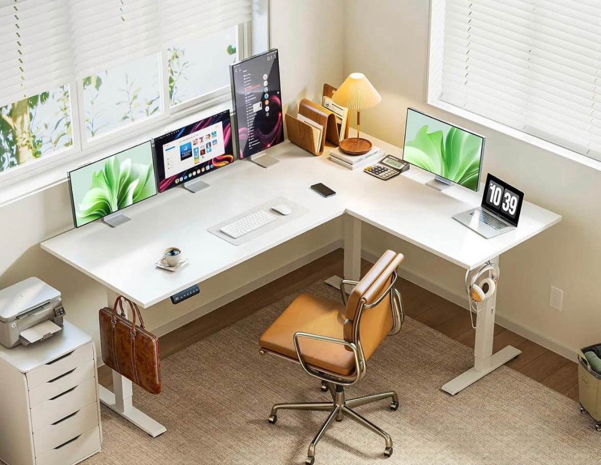 Condition: Brand New in Box. 71-inch Electric Standing Desk. Ergonomic L-shaped design for corner placement, perfect for home offices, workstations, or reception areas. Key Features: • Electric Lift: Smooth height adjustment for sitting or standing. • Large Workspace: 71-inch surface provides ample room for multiple monitors. • Reversible Design: Can be configured to fit your specific room layout. • Ergonomic: Promotes better posture throughout the workday. • Color: White (008) Pickup Info: • Easy Pickup • Policy: First come, first serve