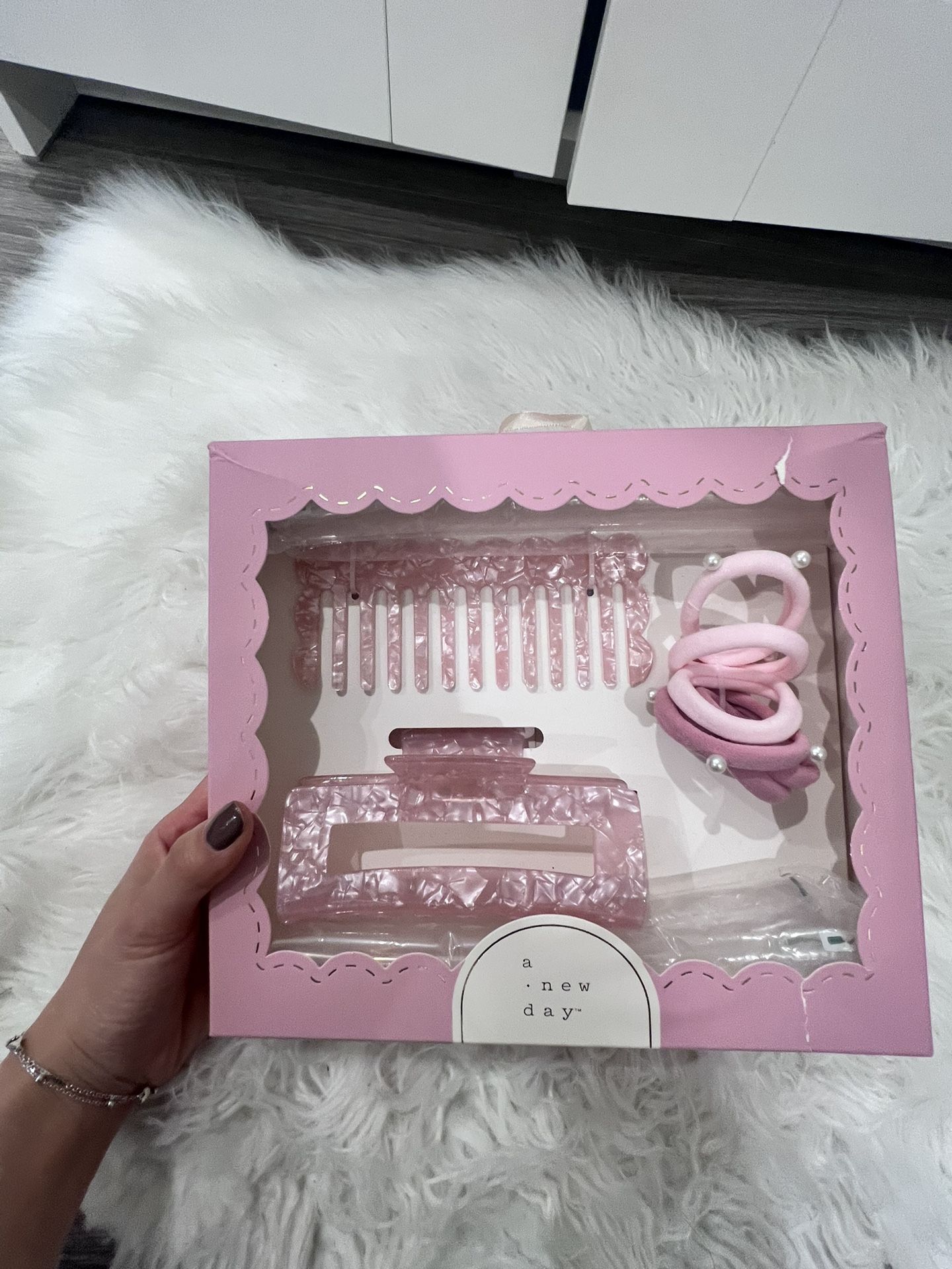 Comes with pearl pink hair ties, claw clip, and comb Brand new but has a tear on corner of box