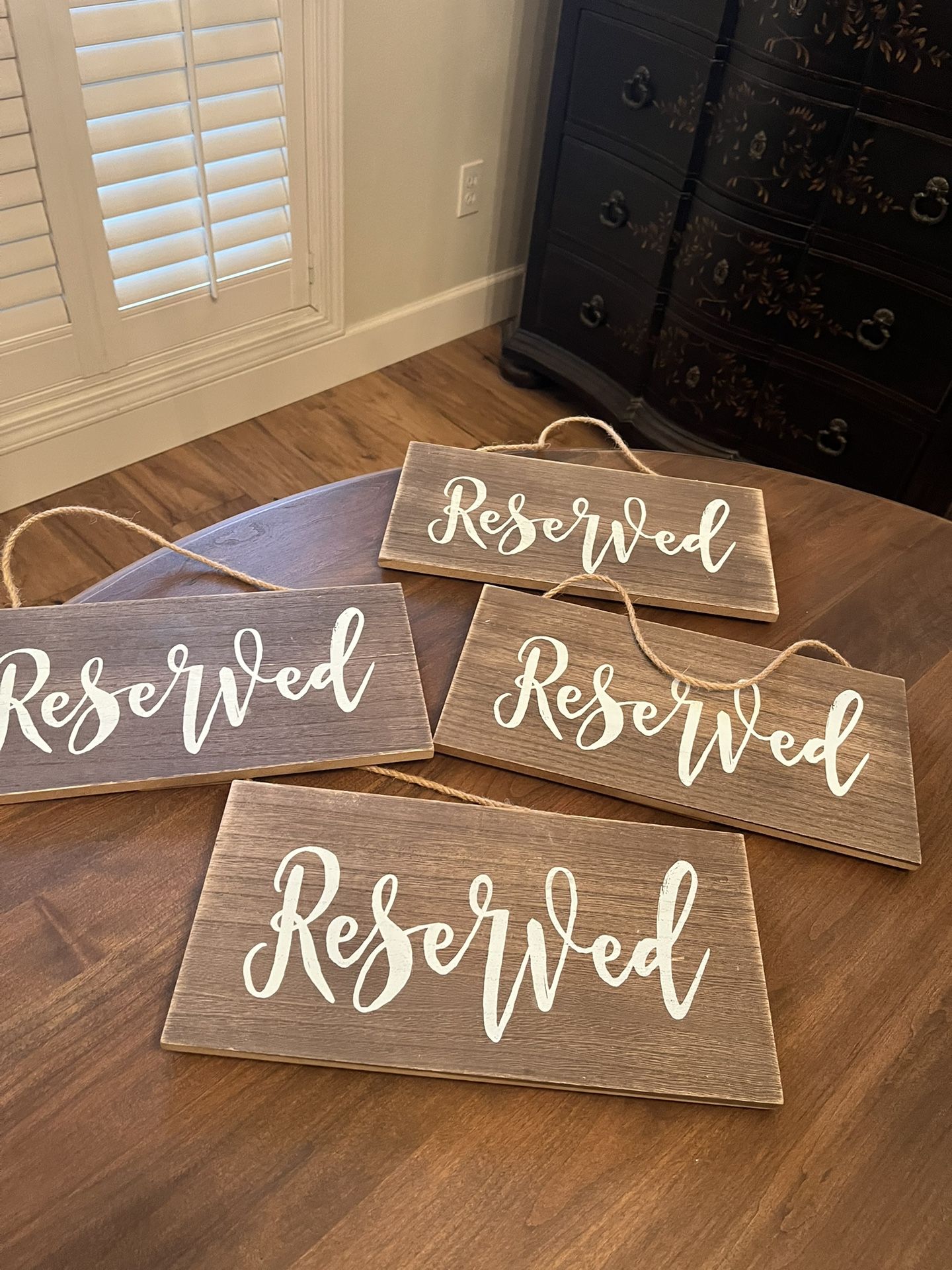 Set of 4 Reserved signs with rope handles. Faux wood. Bought for wedding and never used . Cash only Pickup Southwest Visalia