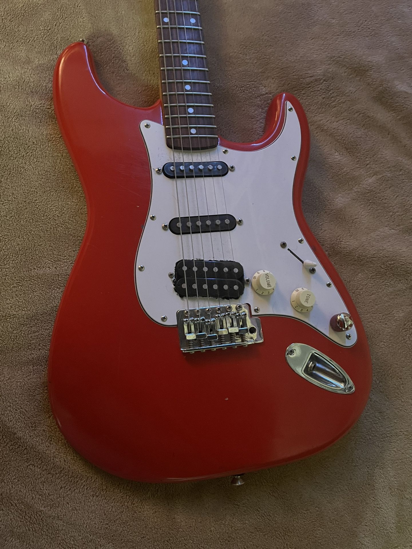 Painted red, has a glitter spill on the back and has a different painted logo on the headstock but is a squier $95 OBO