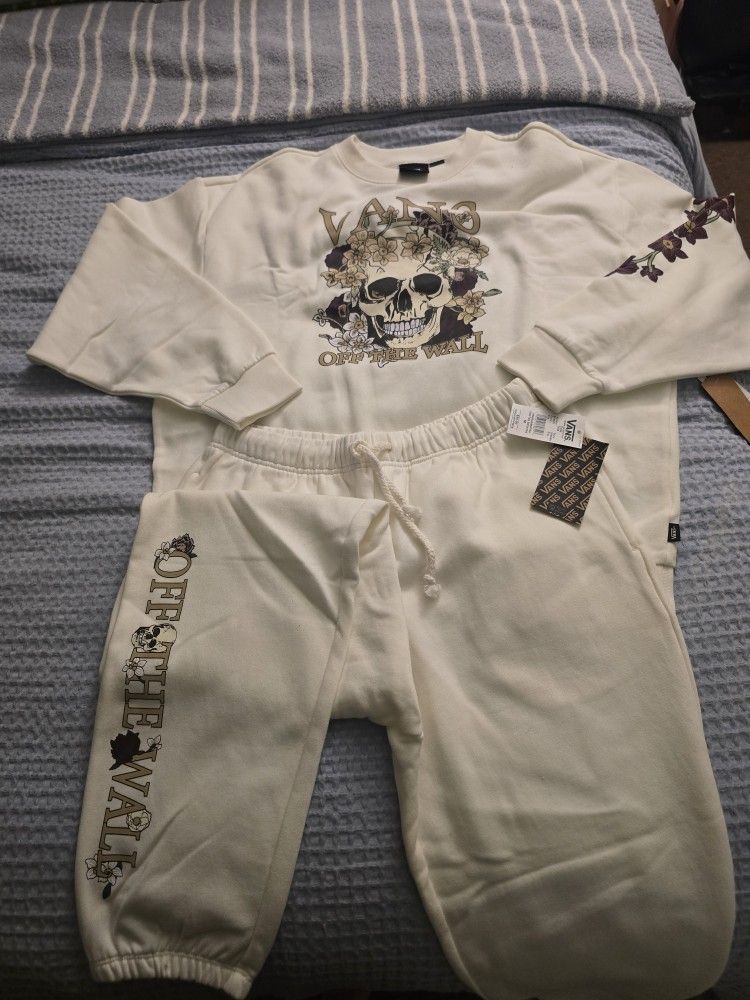 Brand New with tags. Women's Vans crew neck sweater and weat pants. Sweater is a size small sweatpants are size medium. The sweater fits more like a medium it's a small but oversized sweater. The print is skulls and flowers