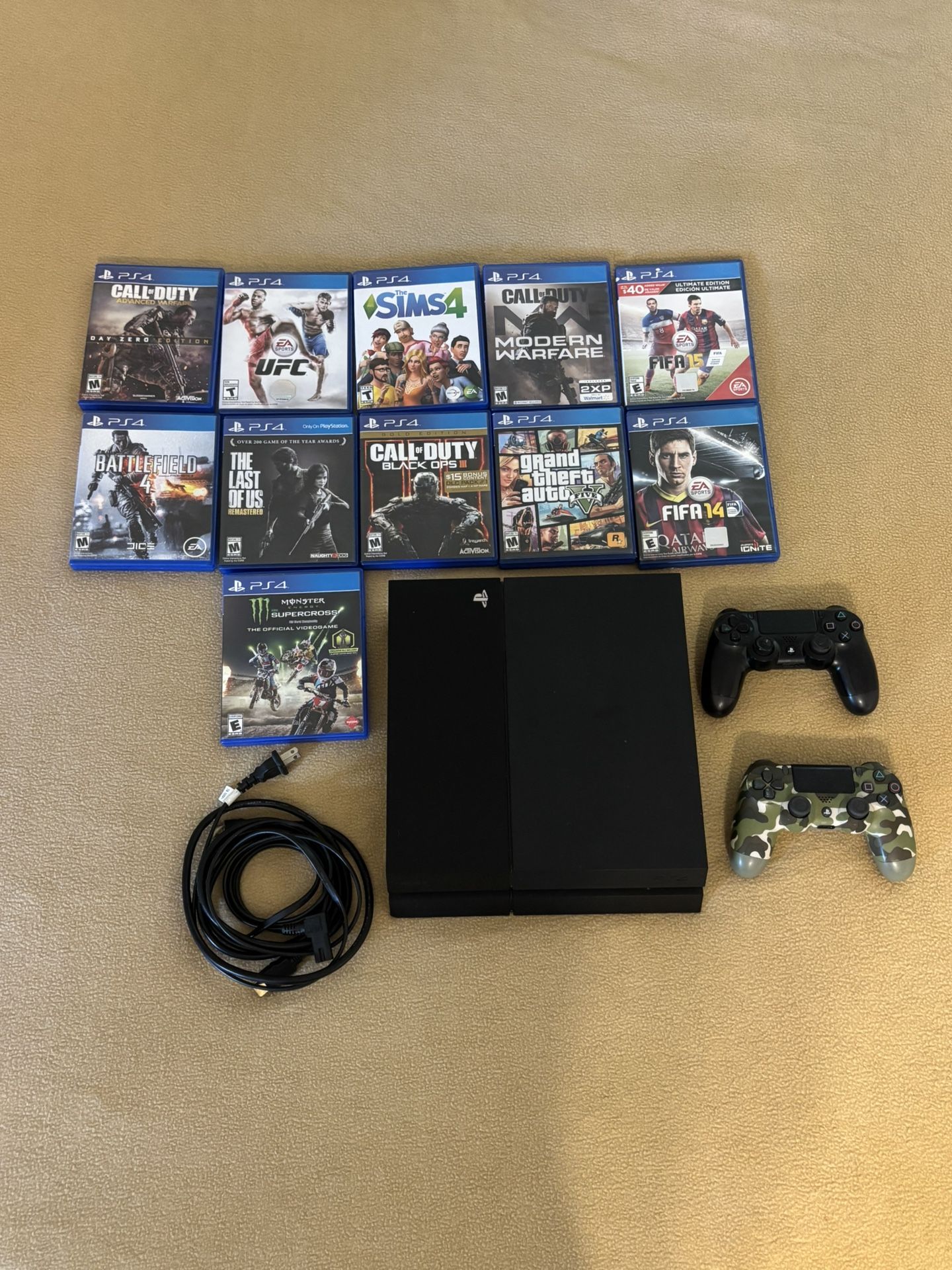Sony PlayStation 4 gaming console PS4 for sale. 2 controllers and 11 games included. All power cords and hdmi cables included.