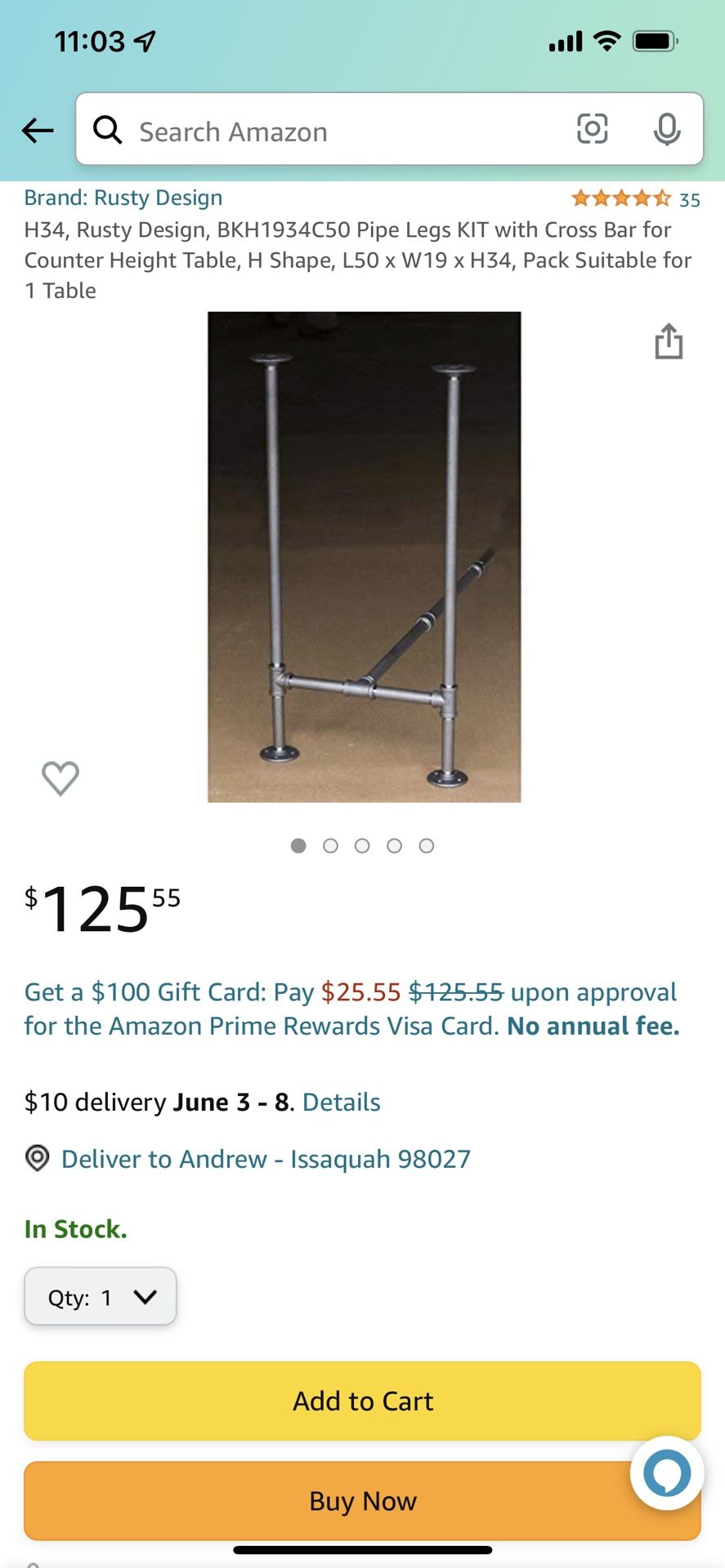 Never opened.  Let me know if you want me to send you the link to the product H34, Rusty Design, BKH1934C50 Pipe Legs KIT with Cross Bar for Counter Height Table, H Shape, L50 x W19 x H34, Pack Suitable for 1 Table Brand Rusty Design Color Raw Steel Black/Grey Material Steel Size 34" Tall Style Industrial Price per set, suitable for 1 table ... Including 3/4” pipe fittings, and steel nipples (out diameter 1") Assembled size L50" x W19" x H34" ... suitable for a counter height table, kitchen island Supplied as KIT and comes as fittings ... assembly and painting REQUIRED Tip: assemble all the pieces together loosely then tighten & adjust to preferred height. It is normal some joints finally loose (apply Teflon tape on loose joints if you are not comfortable) As industrial pipe nipples, the surfaces have various textures and shades of color. Surface raw steel with machinery oil, cleanse prior to use or paint