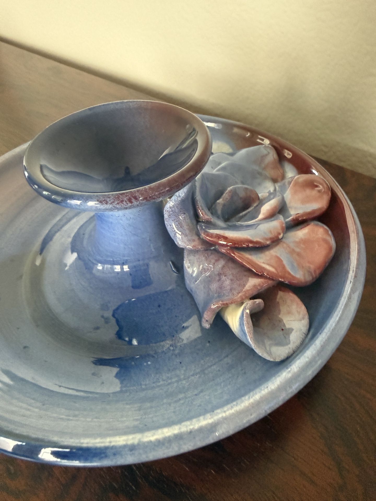 This is a NEW, handmade, ceramic, Japanese incense holder that could also be used as an Ikebana vase. It is beautiful and the colors are really nice. It is also signed on the bottom. Dimensions are 7.5 inches in diameter by 2.5 inches tall.