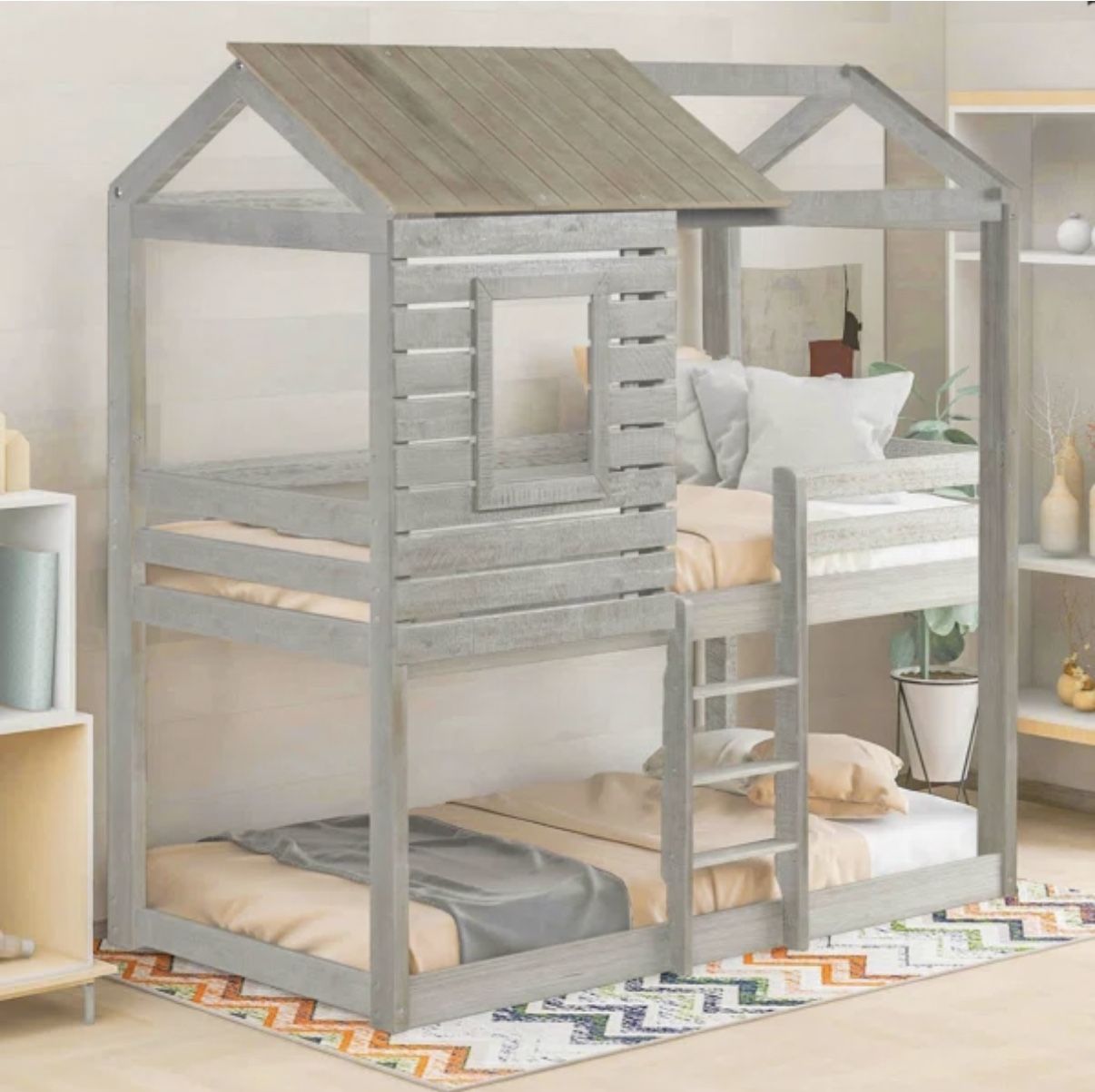 Take your children's bedroom to the next level with this product that not only saves space but creates an exciting atmosphere for your kids. Featuring a pitched roof and playhouse-inspired wall with a window, this bunk bed doubles as a semi-enclosed play place perfect for kids to study, watch TV or explore their imaginations. With guardrails, a ladder, and a sturdy pine frame, this bunk bed offers a safe space for your kids to get a good night's sleep.