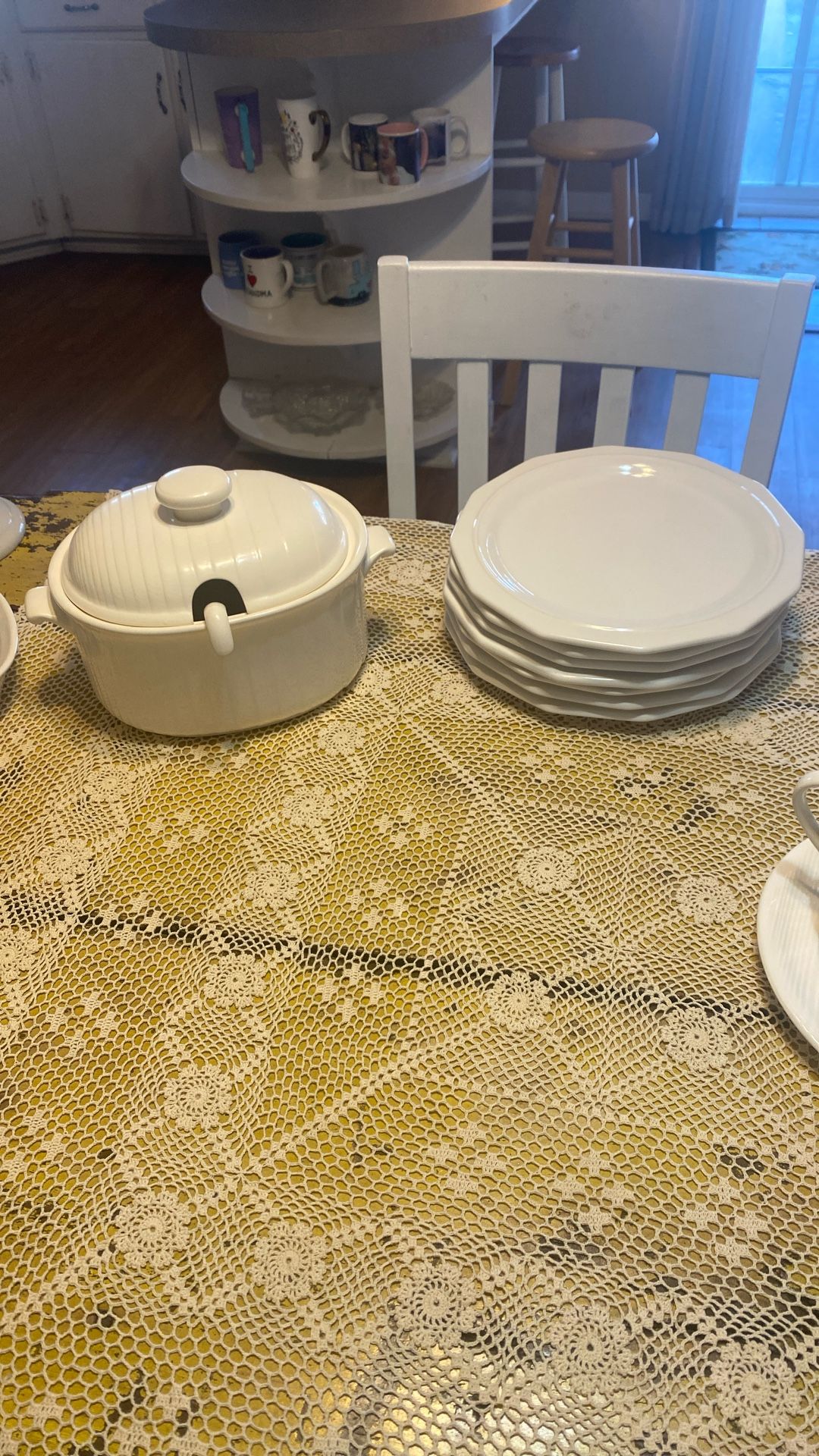 Beautiful large soup bowl, creamer, small soup bowl, serving platter seven dinner plates five dessert plates two saucers two soup bowls $20 for all Small gravy boat with laddle