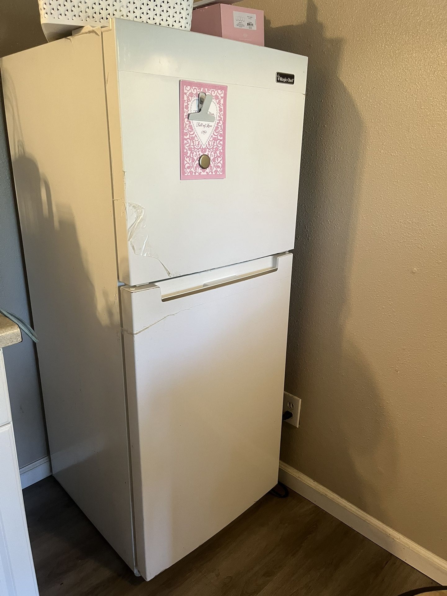 Magic Chef refrigerator! Still has wrapping around so will be like brand new. Just has a crack where the condiments are at but nothing will fall. 75$ lowest price