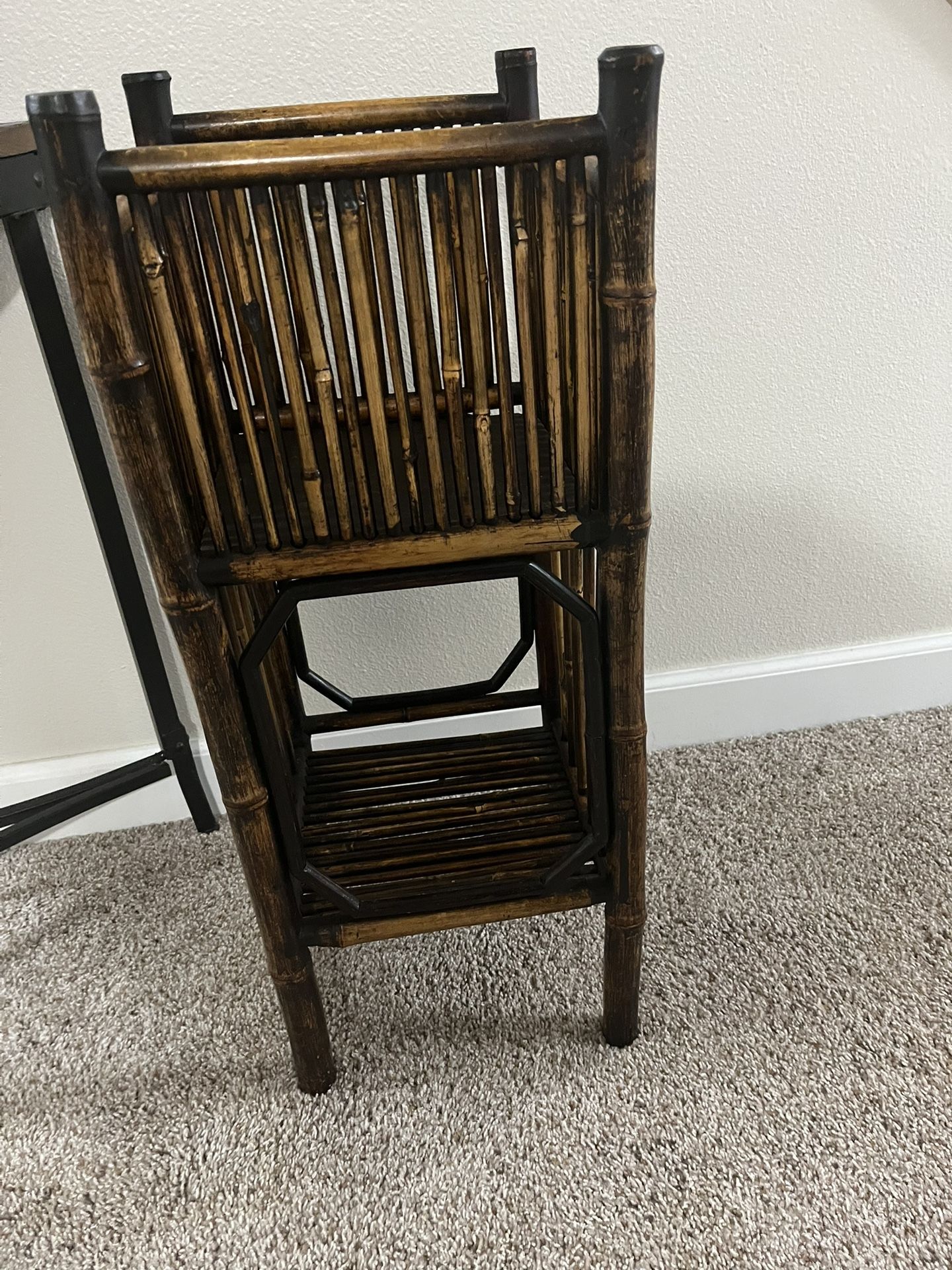 In Great Condition. Mid-Century Modern or Chinoiserie style, are handcrafted from natural bamboo with a distinctive dark finish produced by scorching the material. The stand is made from genuine bamboo, which is known for its durability and unique natural texture and patterns. It features a square frame with two tiers or platforms, designed to display plants or other decor. The dark, rich color and design are characteristic of vintage "tortoiseshell" or "burnt" bamboo furniture popular in the mid-20th century. Due to its size, it can function as a plant pedestal, a small drink table, or a general accent piece for bohemian or tropical decor. 12” x 12” x 30” tall.