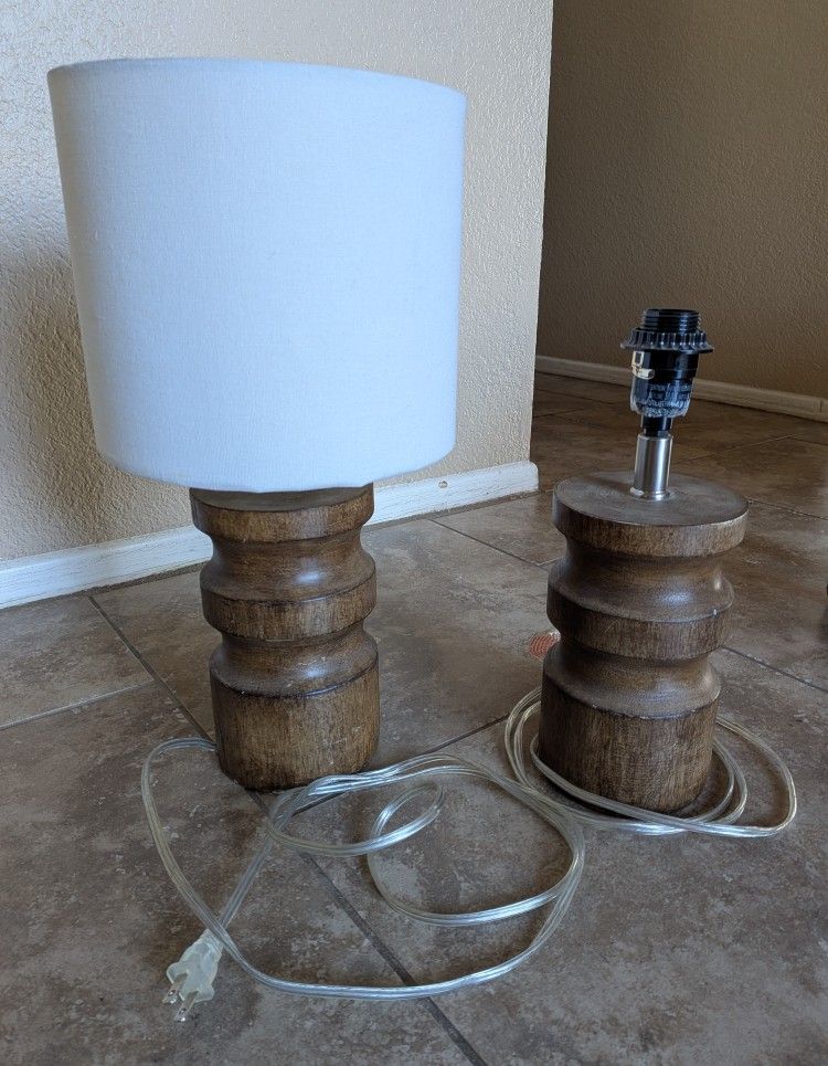 Price is for both. Sold together. They have a rustic look. I used them for like a couple of months and been stored since. Still in great working condition. NOTE - they have been moved around in storage and one of the lamp shades cracked so I tossed it out. The other lamp shade is ok but has a few small cracks on the inside. Nothing major as you can see in photos. One of the lamps will need a replacement lamp switch as well which are very inexpensive for a pack of them. Can be purchased at Walmart/Target/Amazon etc for like a few bucks. Each cord measures about 5.5 feet long. With lamp shade each measures about 17.5 inches tall. Without lamp shade each measures about 13 inches tall. The base is just under 5 inches wide. BULB NOT INCLUDED. Pick up only. No delivery etc. CASH ONLY.