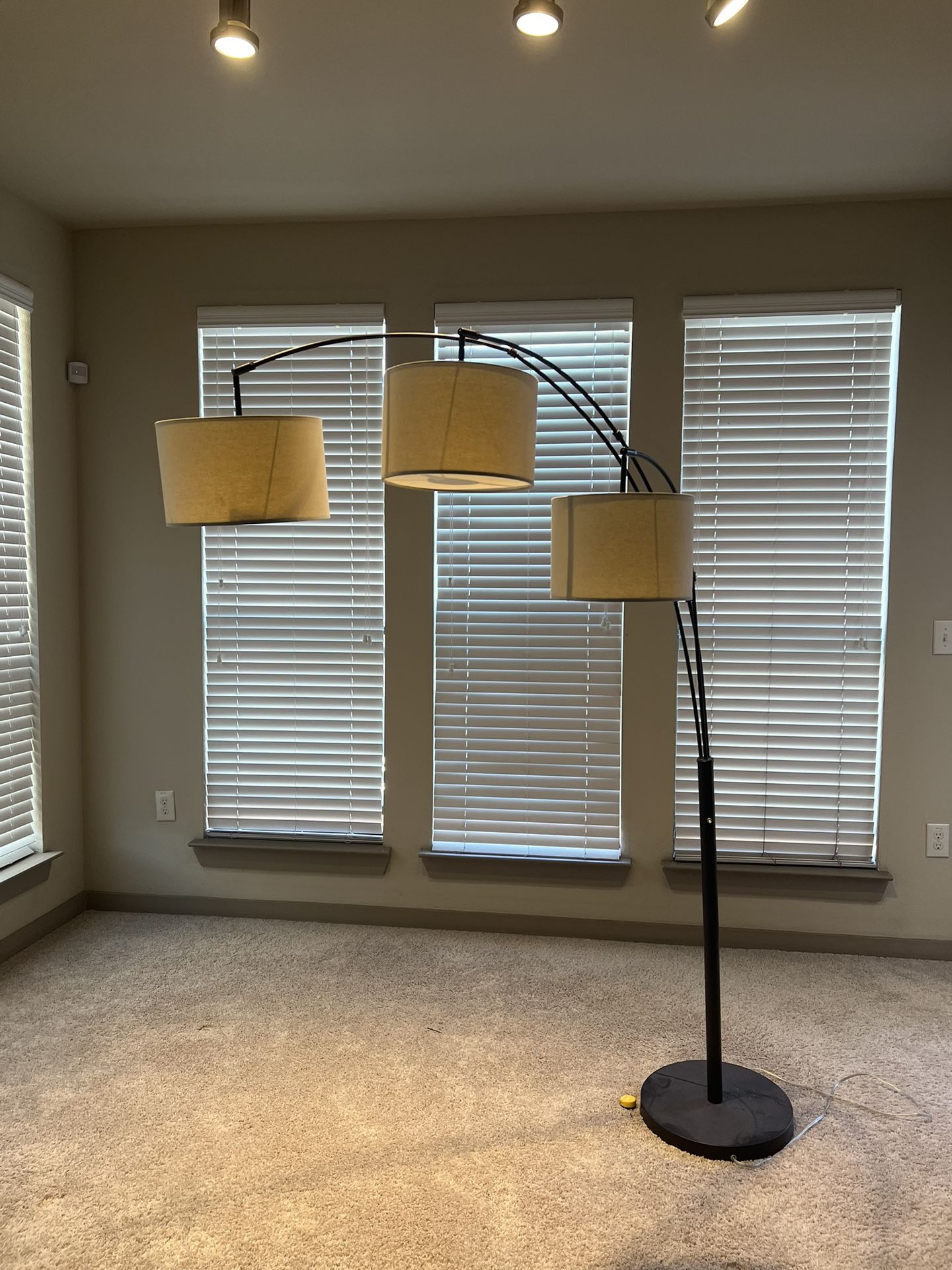 Stylish 3-arm arc floor lamp with fabric drum shades. Provides great ambient lighting and makes a perfect statement piece for a living room, bedroom, or office. Sturdy base and sleek modern design. All lights work perfectly and lamp is in great condition. • 3 adjustable arc arms • Neutral fabric shades • Modern / contemporary style • Tall floor lamp with solid Pickup only. Message me if interested!