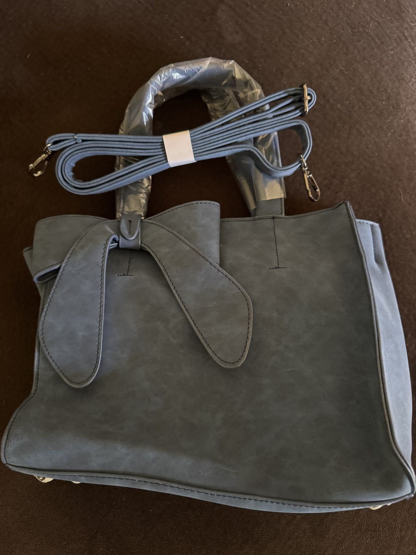 This blue suede faux purse is a crossbody purse. It still has the plastic on the handles and the body strap tucked inside the purse. Never used. Found it in the back of a closet.