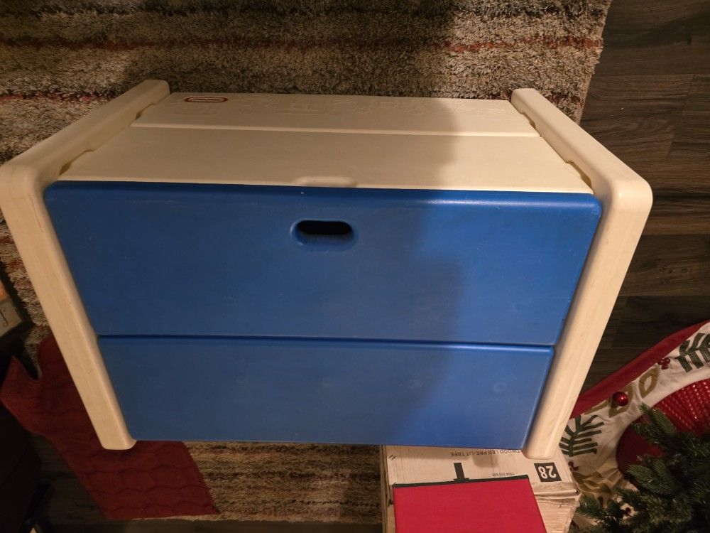 Vintage Little Tikes Plastic Toy Box Storage Chest Blue/White Made In USA 1990s Vintage Little Tikes Plastic Toy Box Storage Chest Blue/White Made In USA Excellent Pre-owned Condition - No cracks in plastic. Normal wear for age and use. . See pictures for full condition. Large size toy box made of durable plastic with the slotted side connections. Measures approx 30" long x 18.5" tall x 18.5" wide