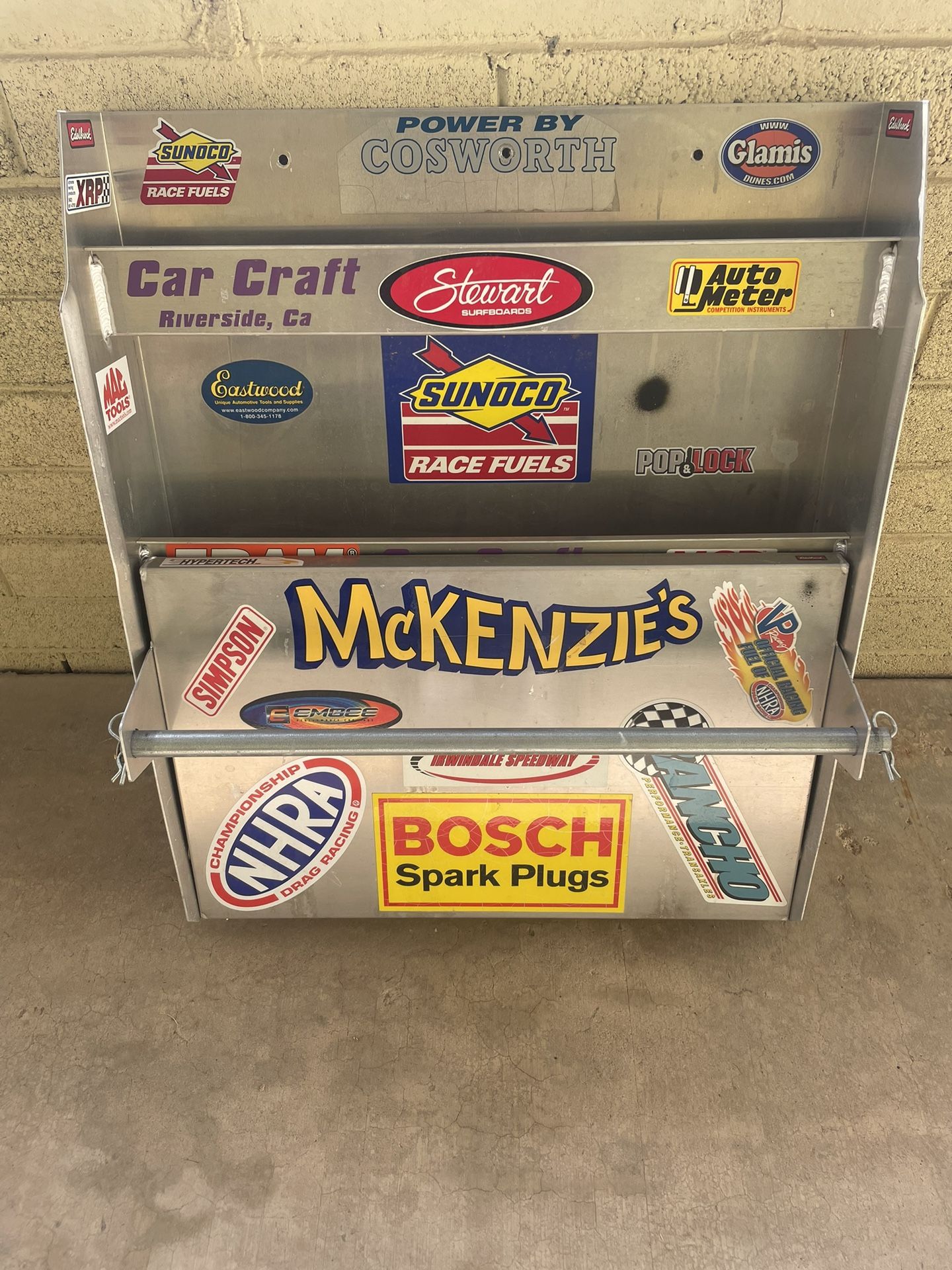 Eastwood PitPal Hanging Storage Shelf Dimensions: H-30” W-25” D-3” for shelves and 9” for Towel Rack Great for mechanics to hold oil, cleaners, towels etc.