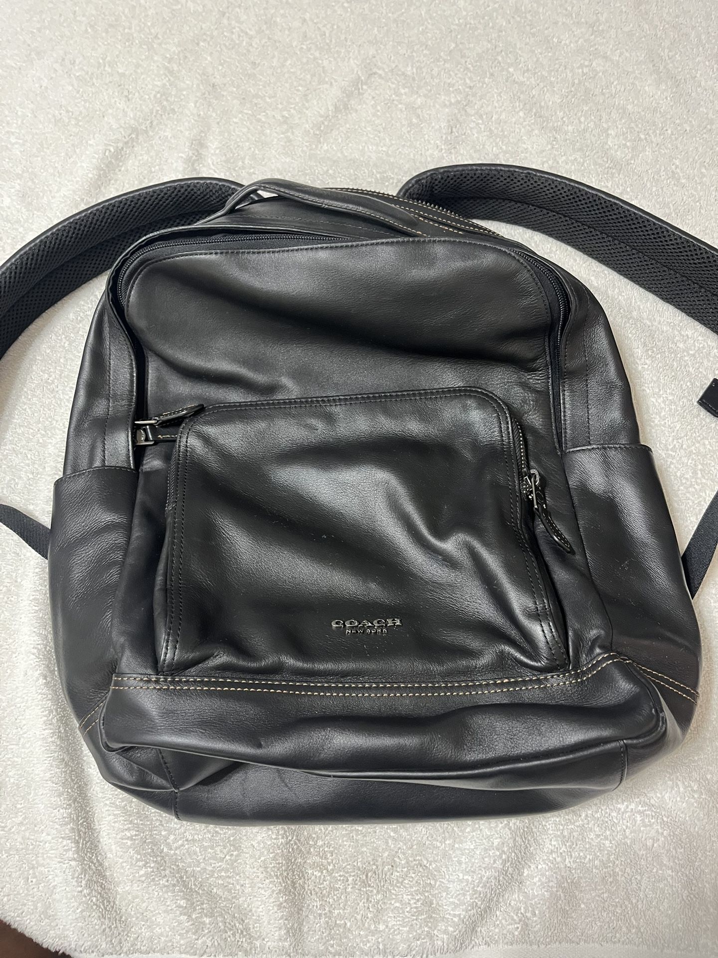 Pre-owned Coach leather backpack in black with adjustable shoulder straps and zippered compartments. Details: • Genuine black leather exterior • Adjustable padded shoulder straps • Front zip pocket • Main zip compartment • Coach creed patch with serial number inside Condition: • Used – good condition • Leather shows natural creasing from use • No major rips or tears • Zippers function properly Includes: Backpack only Authenticity: Serial tag present. Sold as shown. ⸻ Inventory ID: 724-24