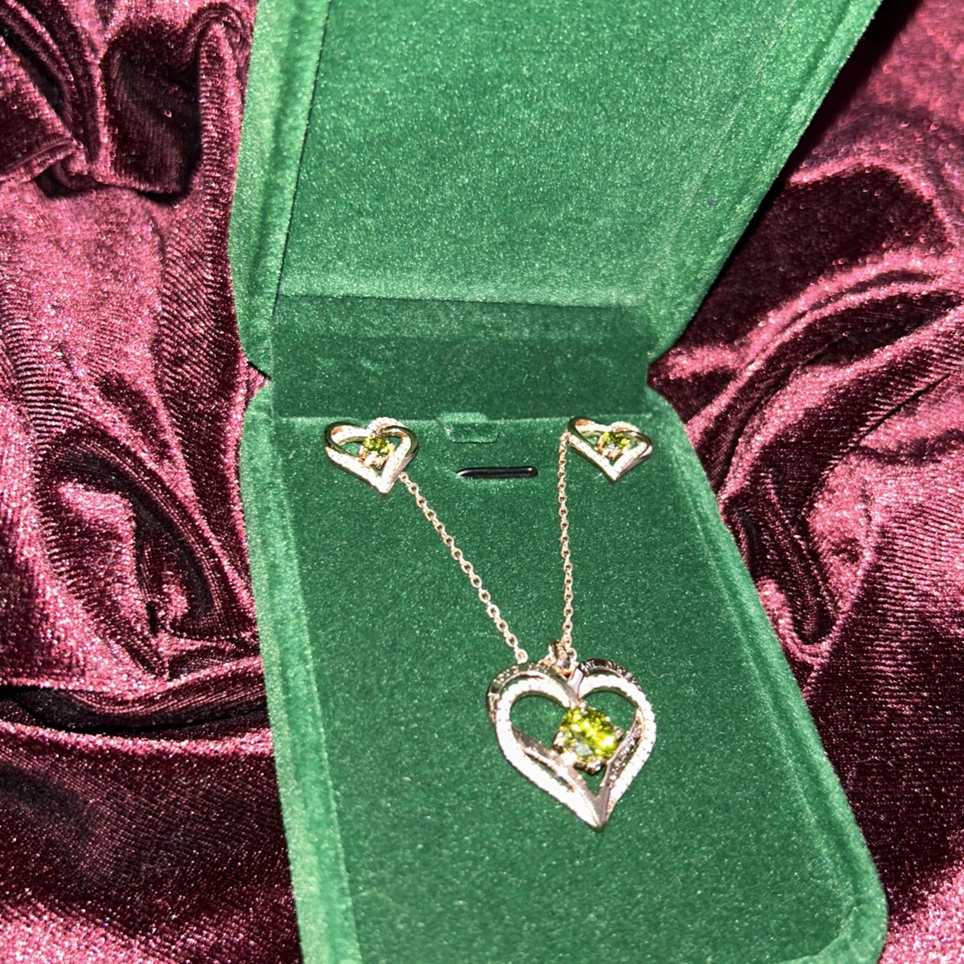 🩷 Perfect for Valentine’s Day! 🩷 ♥️Earrings and matching necklace 🩷Necklace reads, “I Love You Always and Forever” ♥️Peridot birthstone (Month of August) 🩷Studded with stones and gold plated