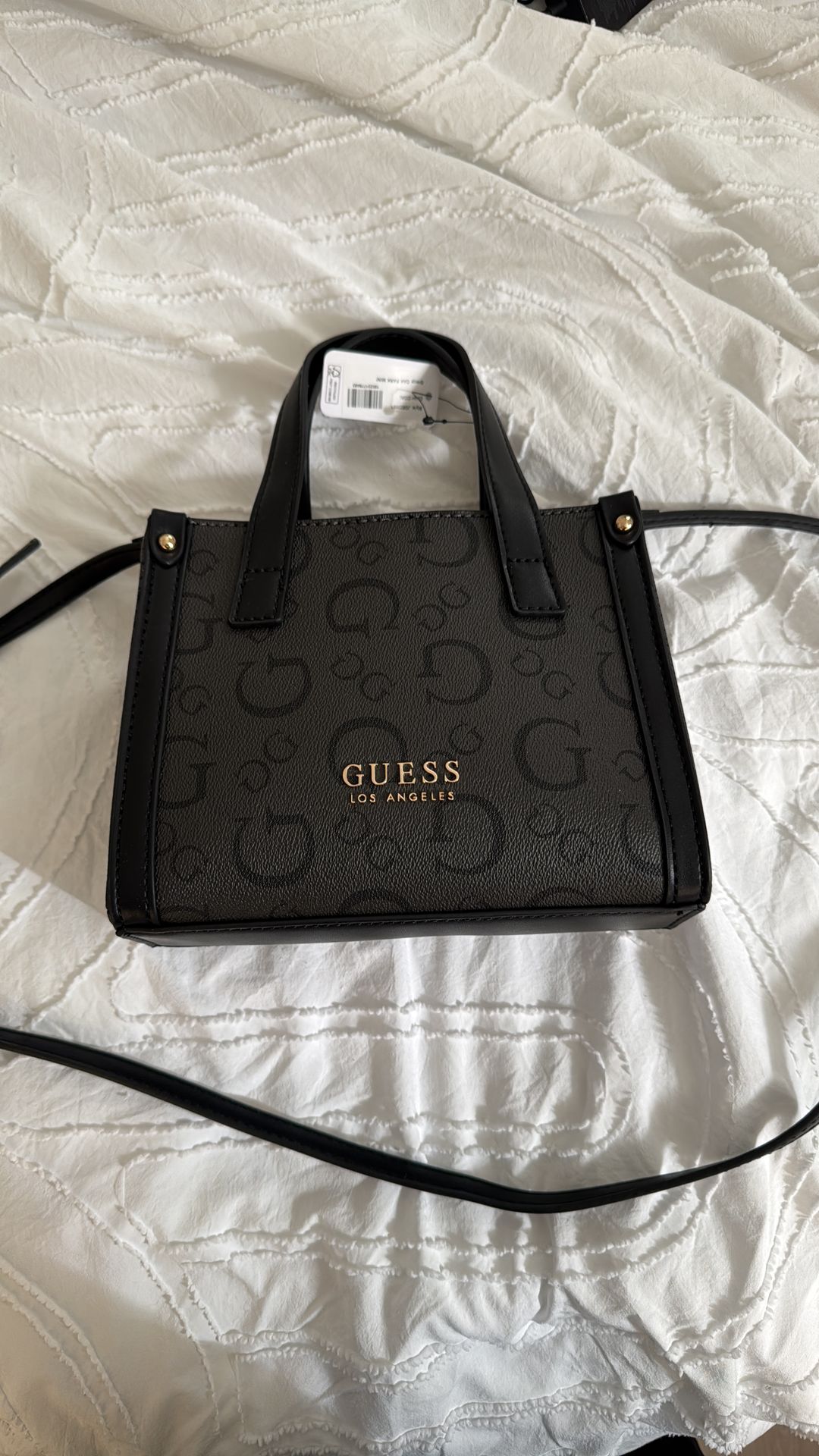 GUESS Oak Park Mini Satchel Crossbody – Coal Logo Print (Style JG823881) Stylish GUESS Los Angeles Oak Park mini satchel in the signature “Coal” logo print. This structured mini handbag features dual top handles, gold-tone hardware, and a removable adjustable crossbody strap so it can be worn as a handbag or crossbody. The compact design is perfect for everyday essentials like your phone, wallet, keys, and makeup. Classic GUESS logo pattern with a modern structured shape. • Brand: GUESS Los Angeles • Model: Oak Park Mini Satchel • Style #: JG823881 • Color: Coal (charcoal/black logo print) • Dual top handles • Removable adjustable crossbody strap • Gold-tone GUESS logo and hardware • Structured mini handbag design Condition: New / excellent condition. Approximate size: about 8–9” wide and 6” tall.