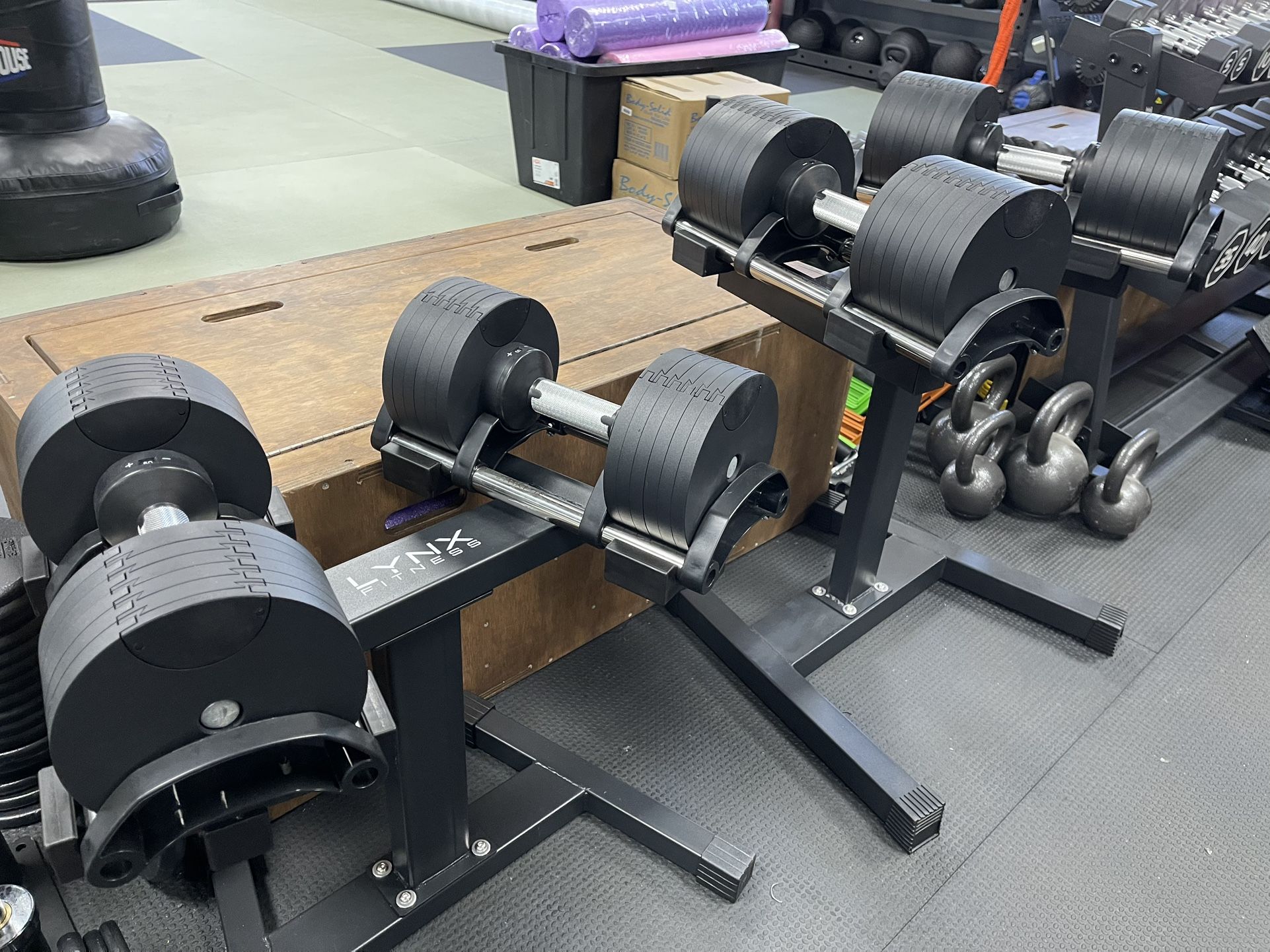 LYNX HALF RACK $950 FUNCTIONAL TRAINER $2800 3 N 1 SMITH MACHINE $3750 ADJUSTABLE DUMBBELLS 9-50lb $349 a pair 9-80lb $449 a pair WEIGHT STANDS $85 ZERO SM200 All in one trainer $2600 SM400 All in one trainer $4000 SM500 All in one trainer $6000 STAIR MASTERS $2600 MACES 10-40lbs $3lb TRAINING HAMMERS 10-30lbs $3lb INDIAN CLUBS 5-20lb $3lb THOR HAMMERS 25-35lb $3lb KETTLEBELLS $1lb SPECIAL KB’s 5-40lb, 5lb increments ALL NEW!! 3/4” 4x6’ GYM MATS $75ea. FUJI MATS 3/4” $135e a 1.5” $155ea. SPORTS TURF contact for pricing 4’ BUMPER CART $220 6’ BUMPER CART $300 BODYKORE HIP THRUST TRAINER $1800 in box Body balance boards $125ea. Prowler Push Sled $240 3 n 1 12x14x16” PLYO boxes $30ea.. Adjustable Dumbbell handles 1” standard $12 a pair Cable machine attachments $10-60ea. Kettlebells 5-50lbs $1.45lb Dumbbells rubber hex $1,25lb Foam rollers $5-20 1” standard plates $1lb Bosu Style balance balls $60ea Trap bars $150ea Plyo boxes $30-80 Tibialis machines $120ea Resistant bands box set Punching bags $150-195 Wrecking balls $220 Boxing gloves $55-80 Wraps $12