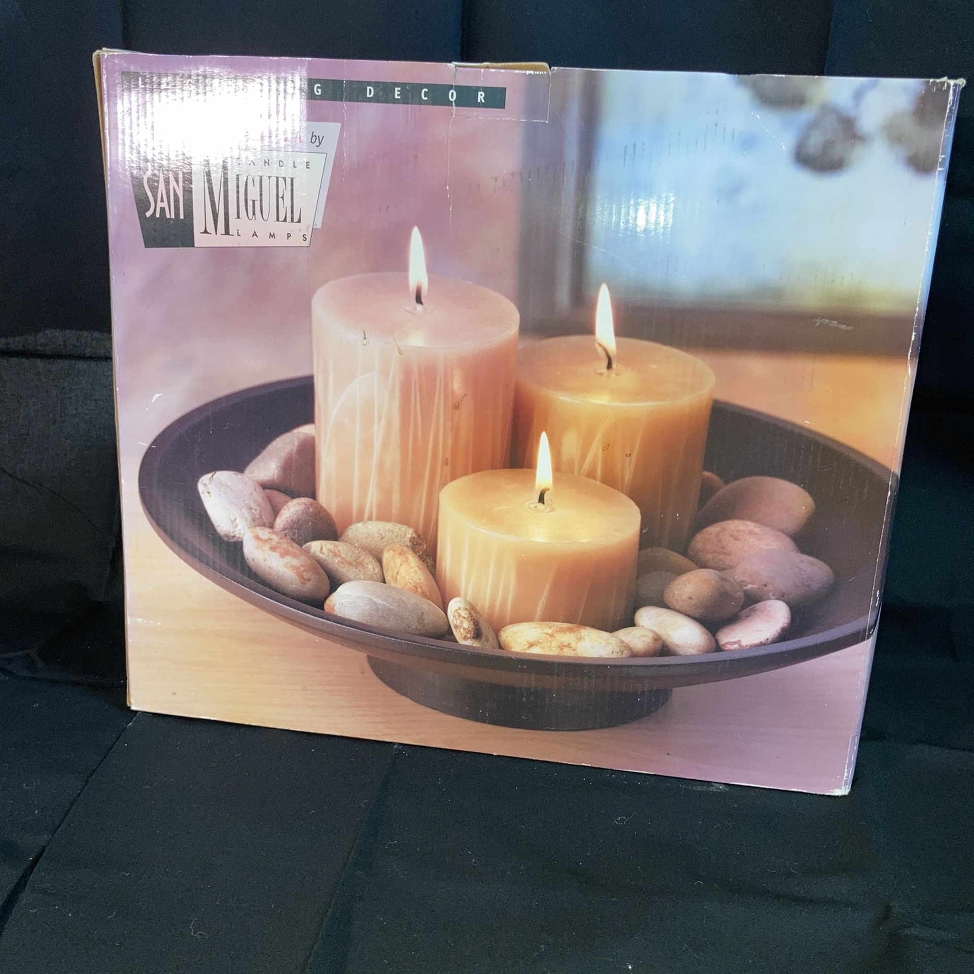 A decorative bowl with 3 large diameter candles surrounded by decorative stones creating a pleasing natural landscape feel. Box never opened.