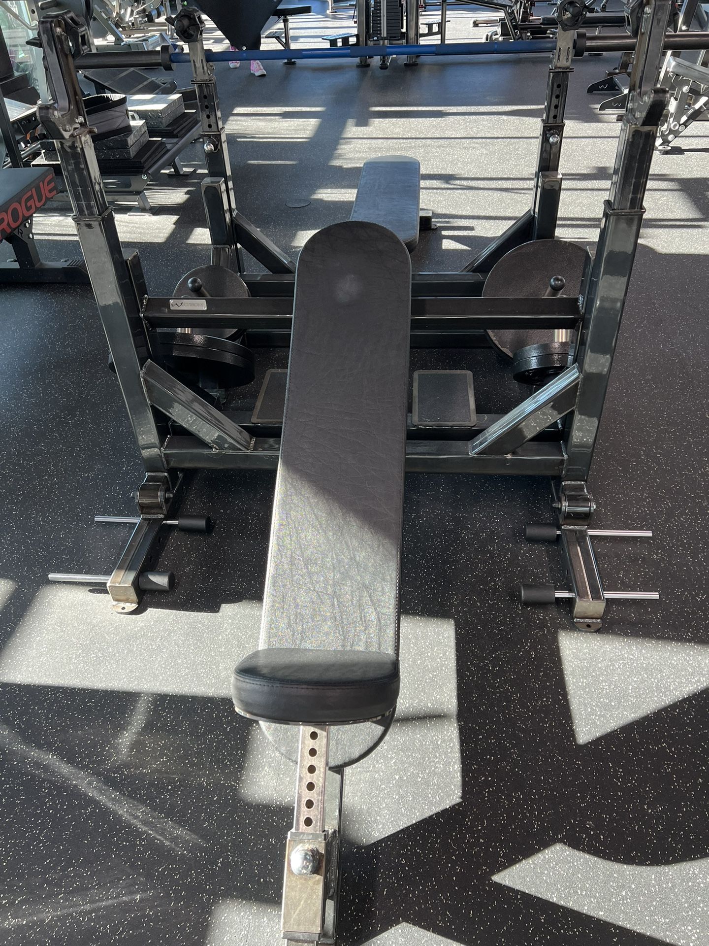 Watson Incline bench press. Adjustable height, spotter stands, hand off application, weight storage, pins for bands.