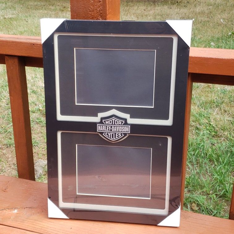 NEW Harley Davidson Motorcycle Double (2) Matted 5x7 Photo Picture Frame - Black. This is new, never used or taken out of it's plastic wrap/seal. There is one small imperfection on the RIGHT side when hung up and on the back edge, looks like something bumped into it and left a little indentation/mark. It's not that noticeable as it's on the backside or would be touching the wall when hung up. Otherwise in new condition. Has (2) spots for 5x7 photo placement. Photos are landscape setting. Has the Harley Davidson Motorcycle logo/emblem in the middle of the frame or in-between the pictures. Each frame/picture section is matted. Nice heavy duty/sturdy picture frame from a great company. Has wall hanger piece/bracket in back. Looks like pictures are easy to place from the back side. [Top To Bottom: ABOUT 18" TALL/LONG] [Side To Side: ABOUT 12" ACROSS] [Depth: A LITTLE PAST 1.25"]