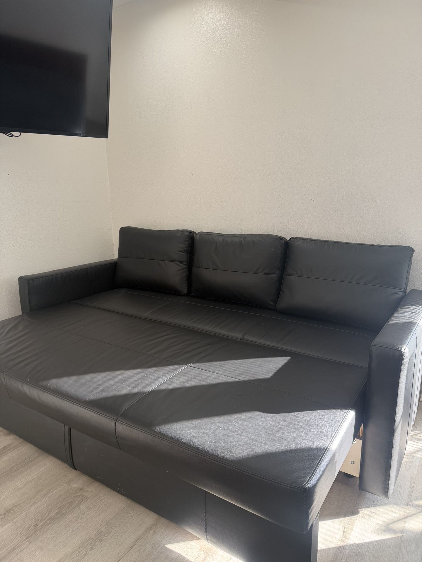Modern black faux leather sofa bed in good condition. Converts easily from couch to full sleeping surface and includes built-in storage underneath. • Clean and well maintained • Pull-out bed mechanism works smoothly • Storage compartment inside • Great for guest room, apartment, or office • From a smoke-free home Normal wear from use (see photos). Pickup only.