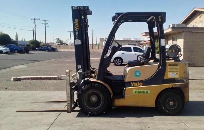2011 Yale GLP060VXNVSE093 Forklift for Sale in Phoenix, AZ. Three-stage mast - 198" (16.5 feet) max forklift height, sideshifter with tilt functions, 6000lb base capacity, pneumatic tires, propane fuel, 42" forks, load back rest, lever-shift automatic. This Yale lift truck is in good working condition. Available for purchase.