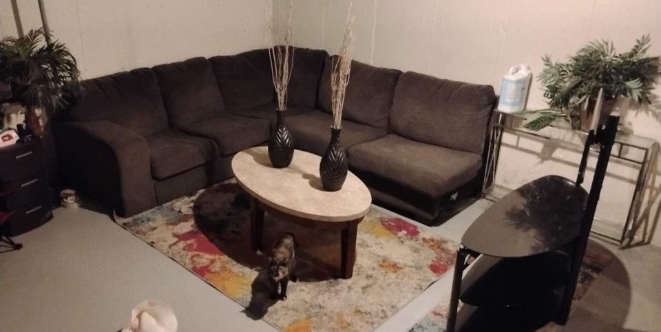 I do not know the dimensions Black couch-$65 Rug Set -$75 ( WILL NOT SEPARATE) Black TV Stand $40 ( Has a little wear and tear I've had it since 2016 price is still firm ) Big Couch Sectional $120 Black vase set comes with silver sparkling straws $20 Basic Metal bedframe size twin $40 Mental big heavy duty dog cage $100