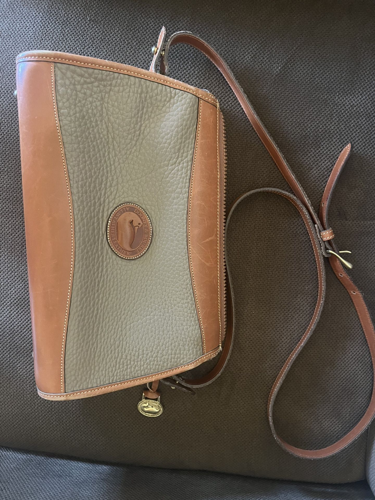 Classic gray Dooney & Bourke All Weather Leather crossbody bag with tan trim. About 90% new, leather still in excellent condition, well kept, and gently used. Perfect vintage piece for daily wear or collection.