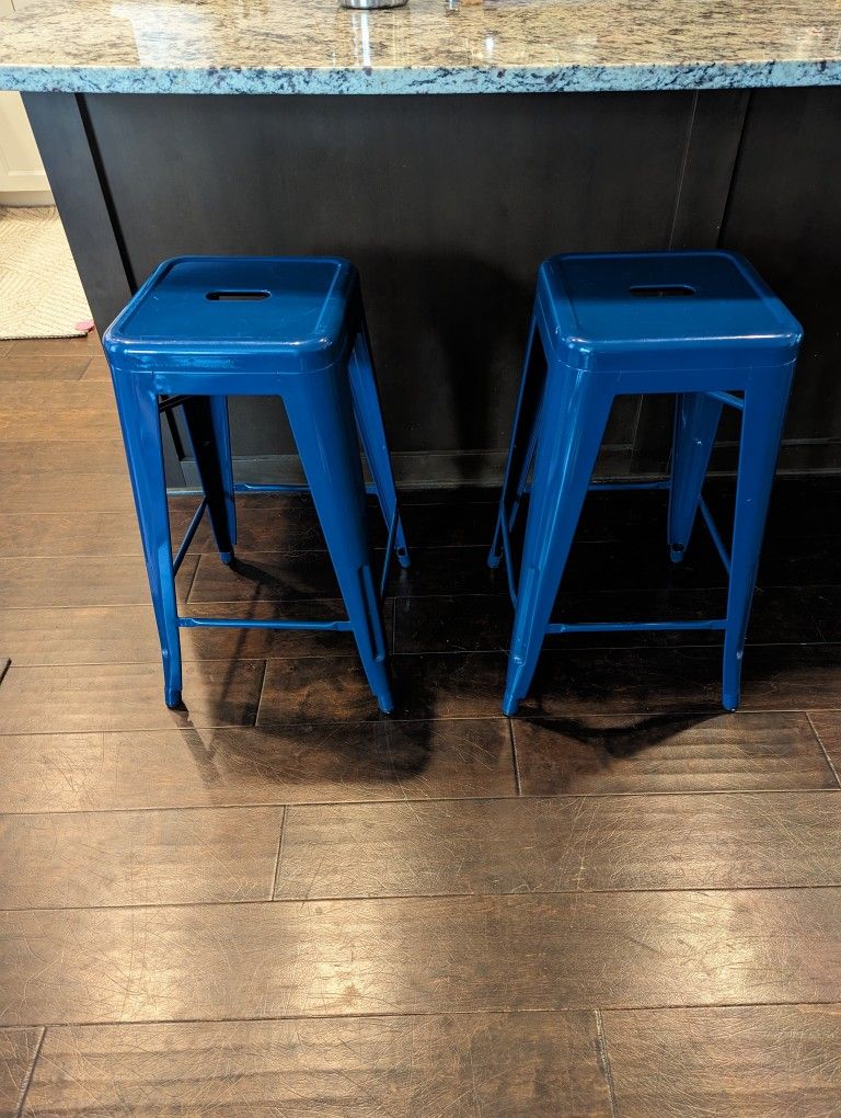 Pair of vibrant blue counter stools. 26" tall. Sturdy, durable.