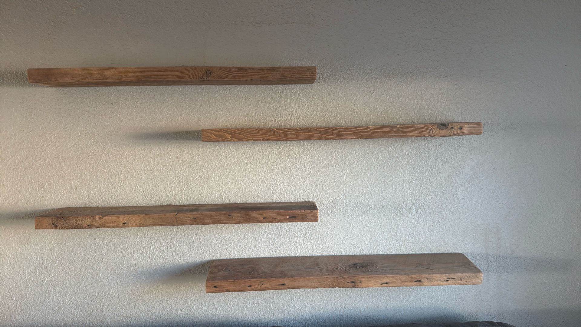 Brought on Wayfair a few years ago By Gracie Oaks Finish: Natural Size: 2" H x 40" W x 7" D Quantity: 2 sets (4 shelves total) Excellent condition, like new. May need light cleaning. Includes screws and mounting hardware. Paid 500 asking Price: $250