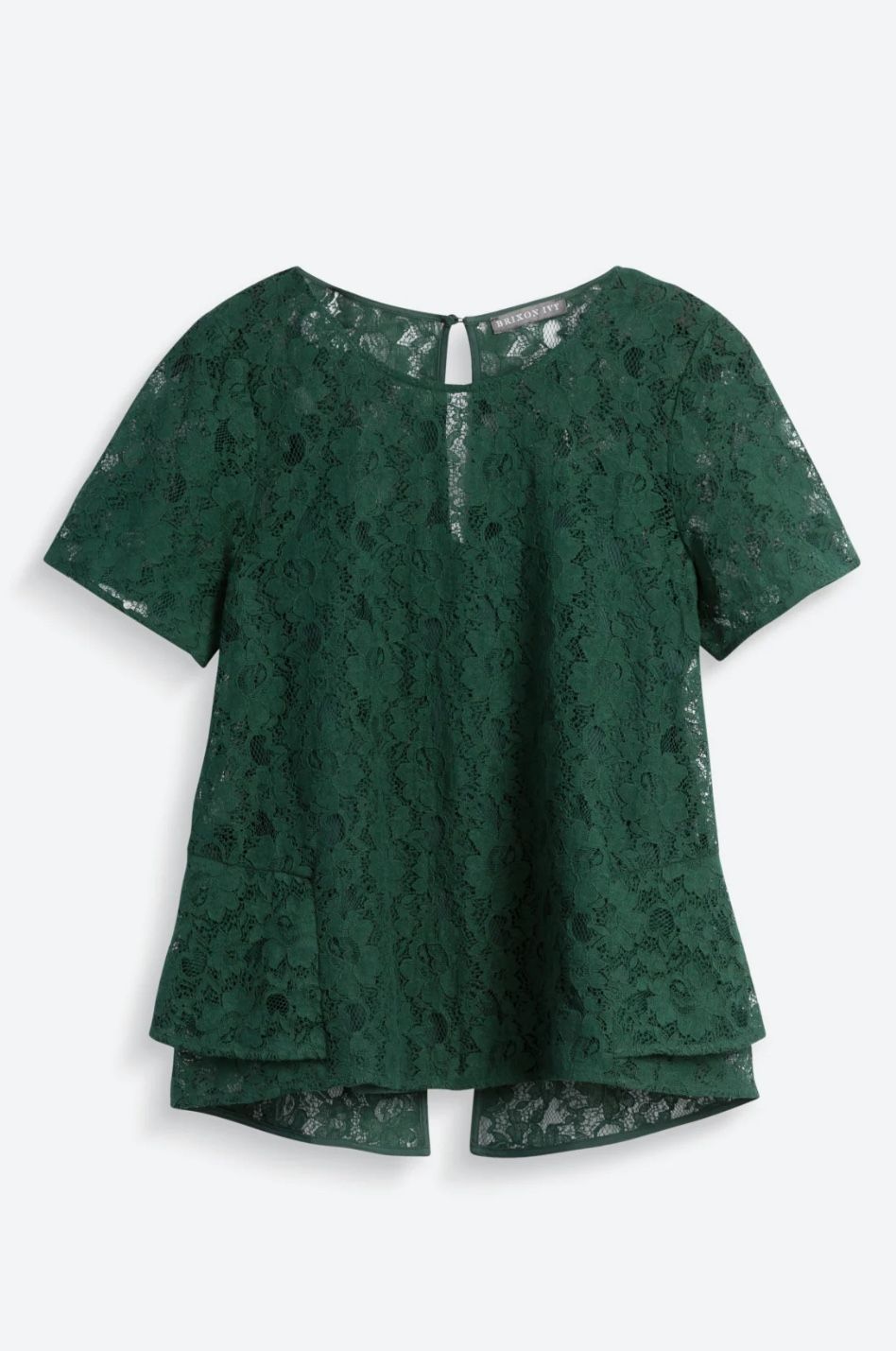 Designer: Brixon Ivy Size: Small Color: Dark Green Material: Cotton, Nylon, Polyester Floral lace blouse Peplum hem Short sleeves Crew neck Open split back with button closure at back of neck Attached cami underneath Stitch Fix exclusive EUC with no notable rips, stains, tears, flaws, etc