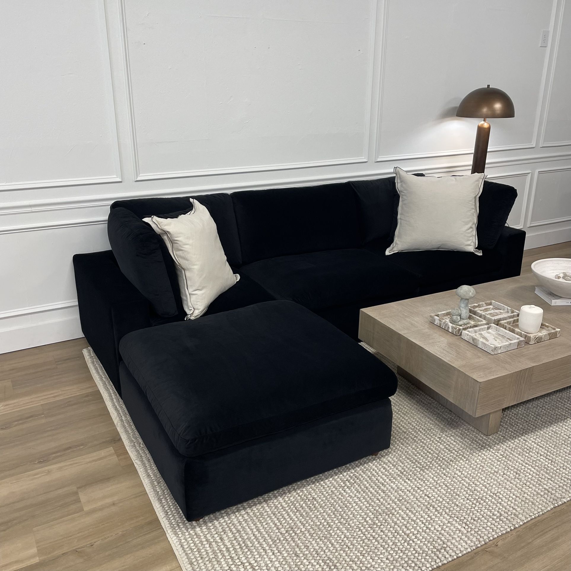 This comes BRAND NEW and it’s a black velvet cloud couch sofa! All pieces are fully modular and can be configured in multiple ways! All cushions covers come off and are machine washable! We have delivery/finance available This setup measures 117” x 77”