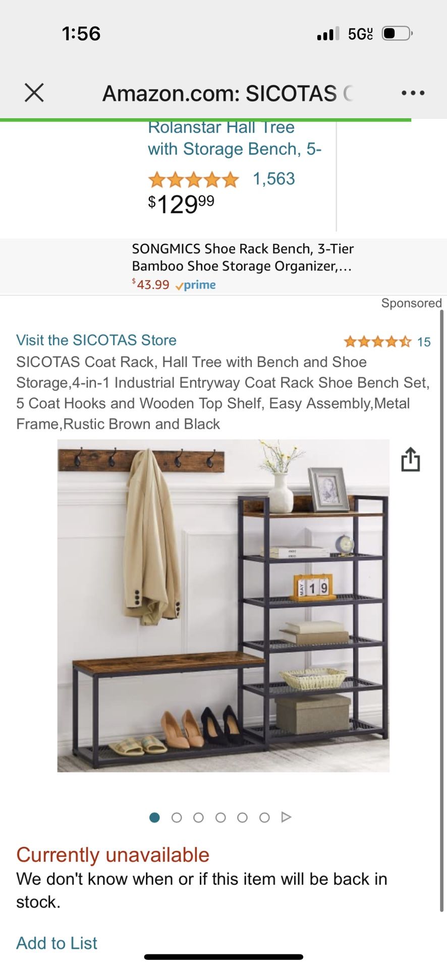 SICOTAS Coat Rack, Hall Tree with Bench and Shoe Storage,4-in-1 Industrial Entryway Coat Rack Shoe Bench Set, 5 Coat Hooks and Wooden Top Shelf,