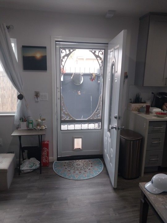 1 year old, Spring Door w/Small Dog door. Door height 80 " Door with 36" Doggi Door height 8" Doggi Door with 5"