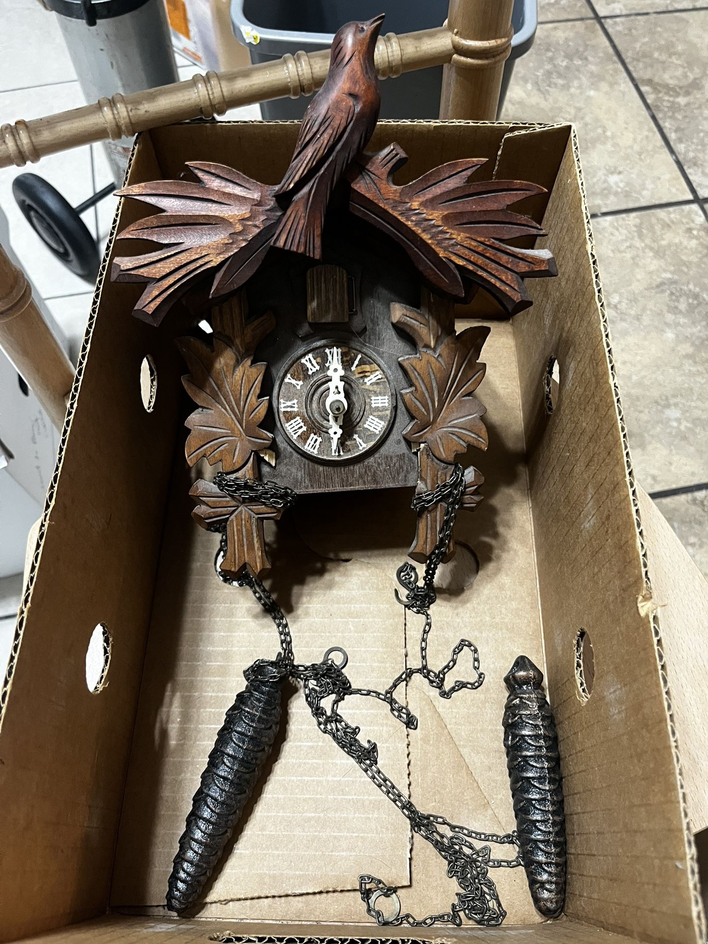 Beautiful vintage Black Forest style cuckoo clock. This is a real mechanical, weight-driven clock with intricate hand-carved wooden leaves and bird details. • Includes: The clock house and both original heavy metal pinecone weights/chains. • Condition: The wood carving is in great shape with a nice vintage patina. Note: It is currently missing the swinging pendulum. It will need a replacement pendulum to keep time properly.