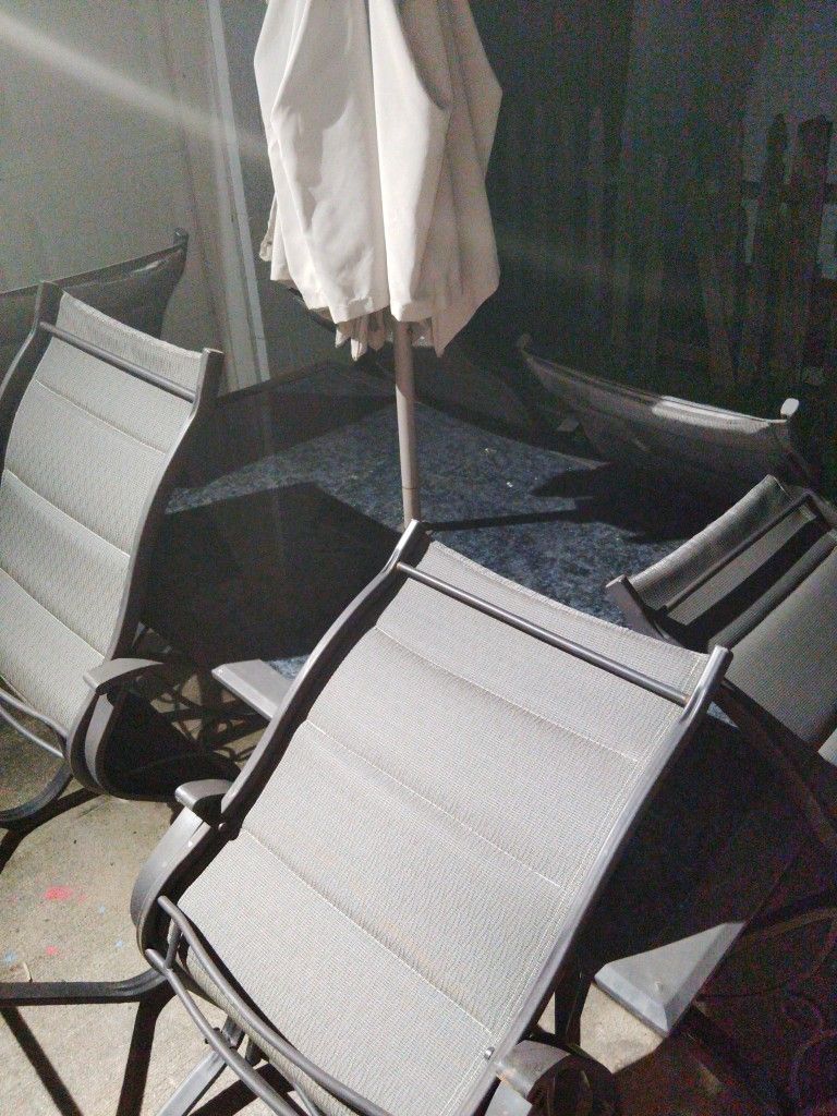 Table set with six chairs in umbrella and them are pictures of the measurements