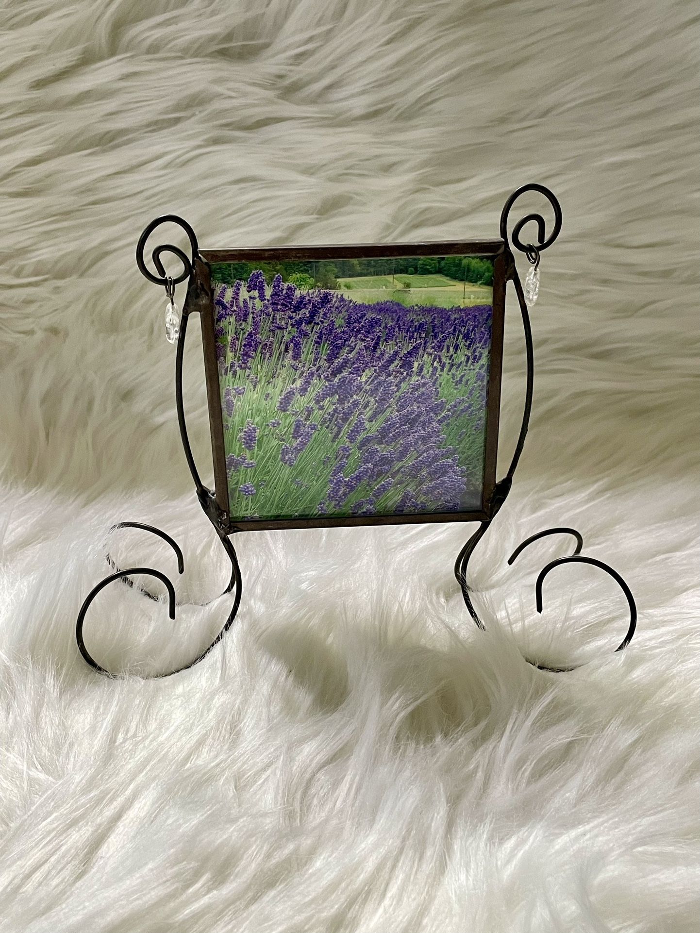 This decorative picture frame holds a 3.25” x 3.25” inch photo. One side of the frame has clear glass and the other side has textured glass that has a leaf look to it. I am including the photos I have had in this frame, but of course the photos can be changed. The frame is metal and has decorative beads on the side.