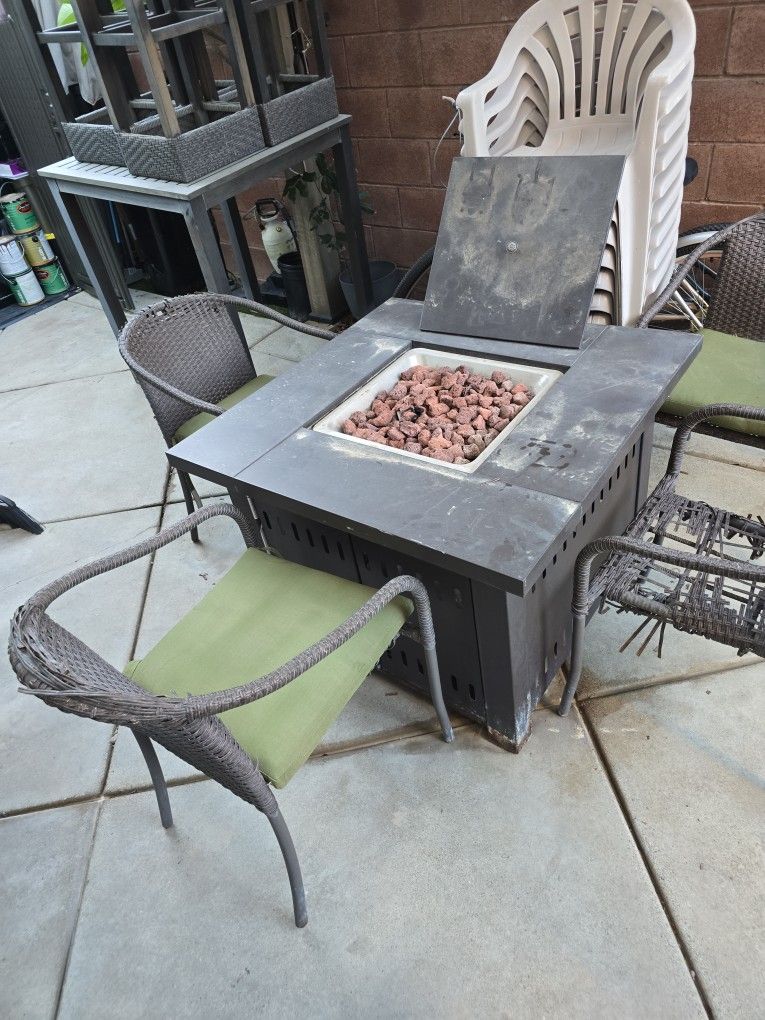 Fire Pit Patio Table And 4 Whicker Chairs, table has some rust and chairs need repair. For scrap or nice project asking $30