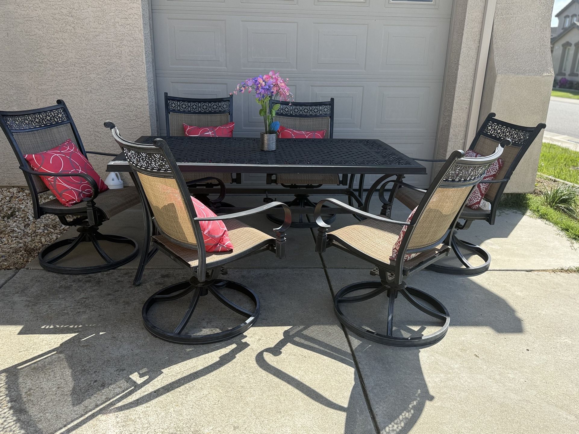 Very nice 7 pc patio set Decor not included Ya chairs that will go with it are the ones on the last Picture