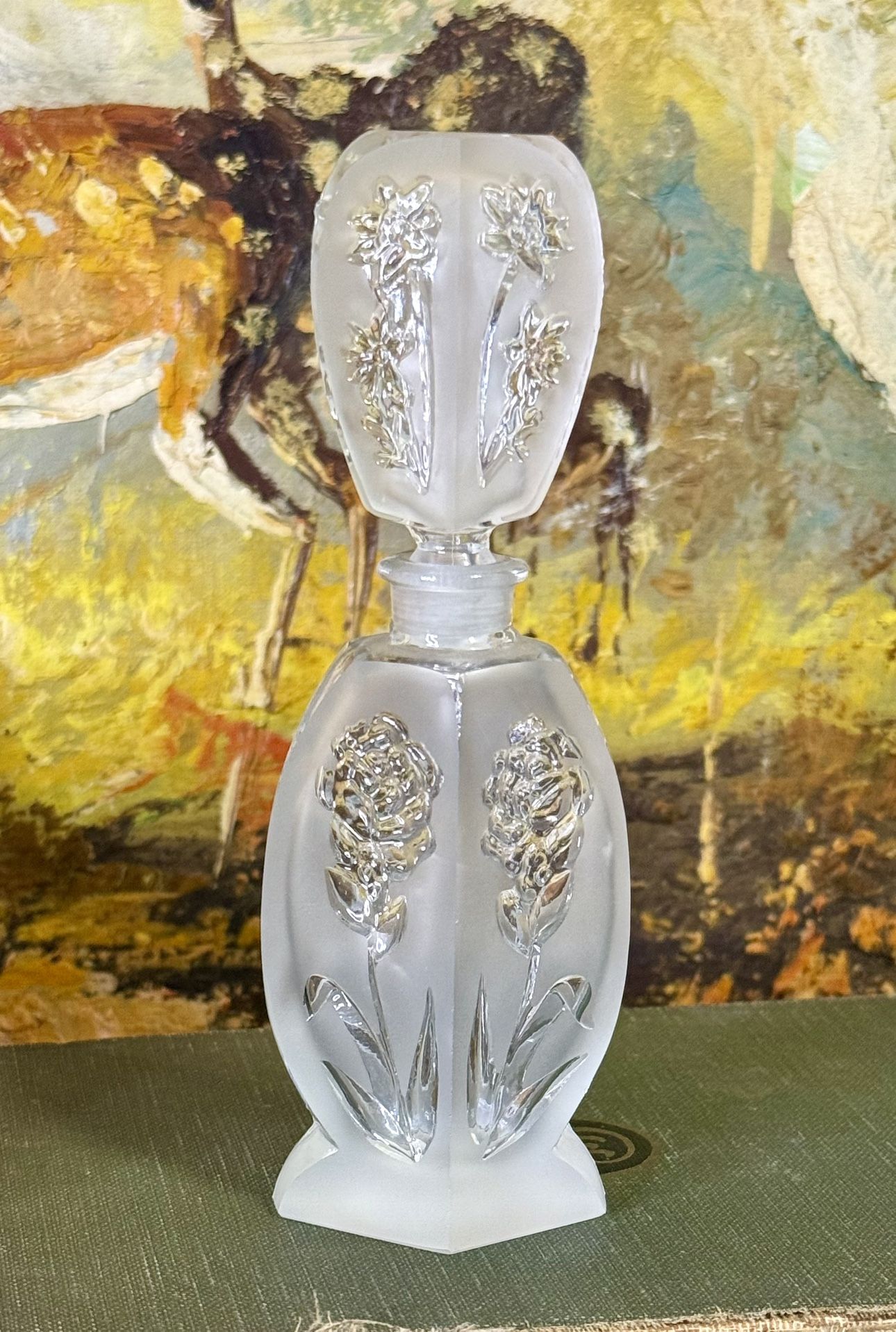Vintage Japan I.Rice clear crystal Perfume Bottle w/ Stopper etched Flowers NEW