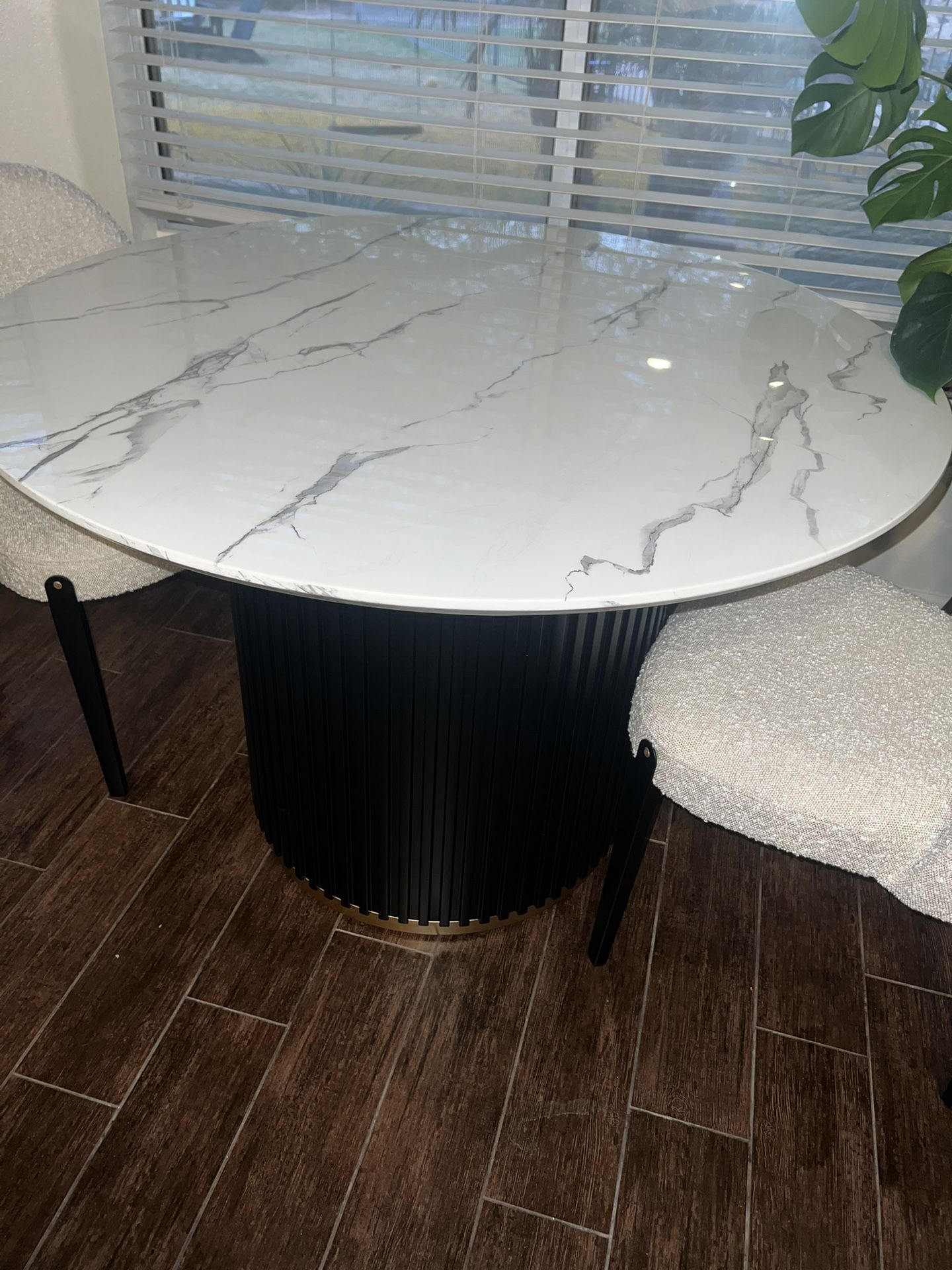 Arhaus Finley mimic -Available now - looks like the thousands more$$. Pieces New @HD$1000MSRP Metal base table *click see More Feau marble top.. 2 boucle fabric chair with metal legs you can buy more at https://offerup.co/faYXKzQFnY?$deeplink_path=/redirect/ too This set =$1k at Home Depot You can get 2 additional chairs @Target on line right now. They are back in stock!! See my profile for more Pottery Barn Restoration hardware pier 1 Z Gallerie world market Upgrade your dining experience with this sophisticated dining set, where contemporary aesthetics meet functional design. The harmonious blend of luxurious materials and sleek silhouettes makes it an eye-catching centerpiece for any modern home. Designed for both style and comfort, this set effortlessly enhances any dining room with its refined appeal. Minimalist yet elegant: perfect for cozy family dinners or stylish dinner parties, this dining set is a statement of modern sophistication bring home a piece that balances aesthetics, comfort, and practicality effortlessly Dimension: round dining table 47W x 30.5tall . armless dining chair 23.03 in. D x 21.7 in. W x 33.46 in. H Refined marble look: the tabletop features a wood base adorned with high-quality imitation marble stickers, capturing the timeless elegance of real marble while ensuring durability and easy maintenance Bold pedestal table base: the cylindrical fluted base in matte black creates a striking contrast, offering stability and a modern, sculptural element to the design Curved, ergonomic backrest: featuring rounded backrest, this dining chair provides gentle support, promoting comfort while adding a sleek, architectural touch to the design Soft boucle upholstery: wrapped in plush boucle fabric, the chairs offer a cozy, textured feel that enhances both comfort and sophistication Matte black metal legs: crafted for durability, the matte black metal legs provide a clean, modern finish that complements the table's bold base