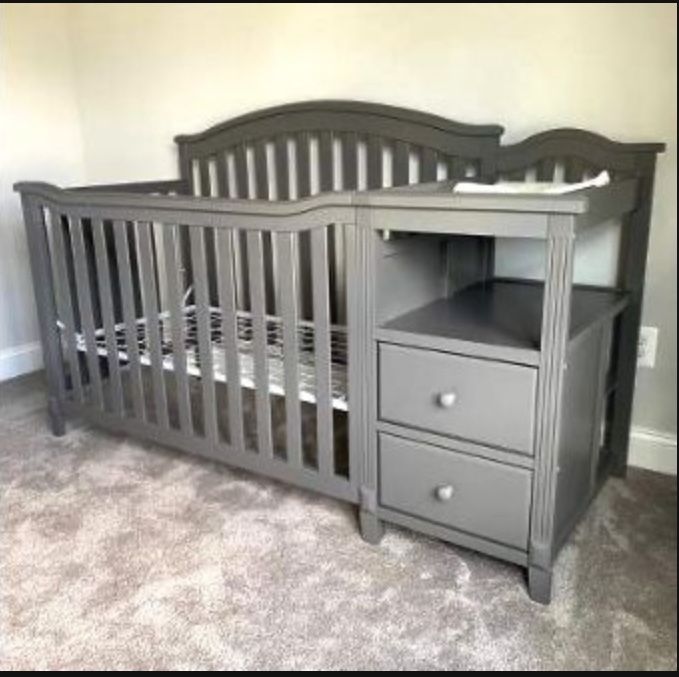 This all-in-one crib with changer and storage drawers combo is a nursery necessity. As your baby grows, this convertible design converts to a toddler bed, day bed, and a full-size bed -- when the changer finally detaches. From Sorelle Furniture. Includes crib and changing station Composite wood construction with painted finish Measures approximately 73" x 30" x 46" This Crib is basically in Brand New condition Because my baby ended up sleeping in my bed all the time. We paid $419.00 for it online plus shipping and I am only asking for $250.00 . It Comes with changing station cushion that fits with a washable cover as well. Disassembled and ready for pick up.